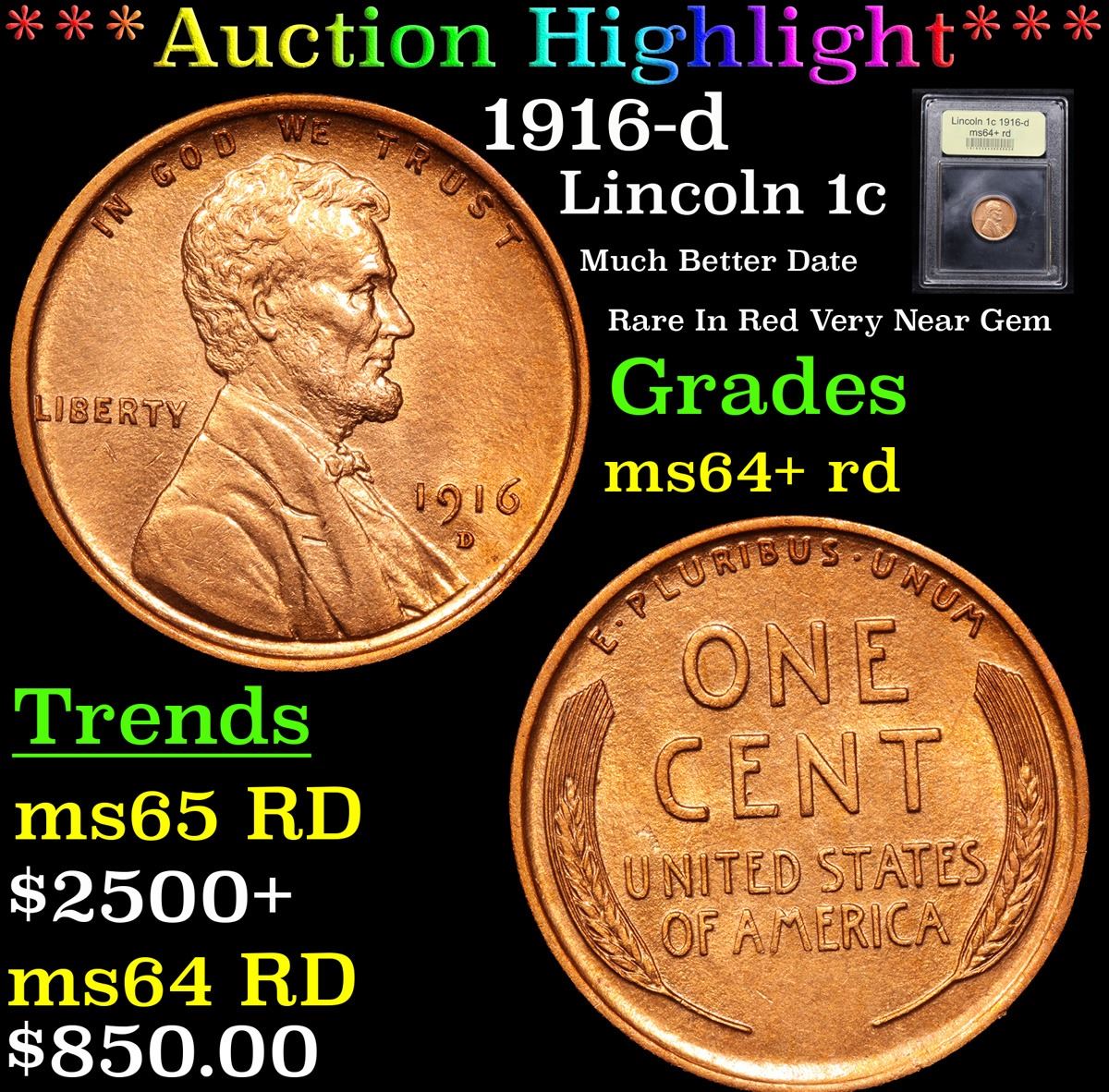 ***Auction Highlight*** 1916-d Much Better Date Rare In Red Very Near Gem Lincoln Cent 1c Graded Choice+ Unc RD By USCG. Out of an original mintage of nearly 36 million, PCGS estimates only 175 survive in ms65 or better. A Corey's Pick, Bid to Win, Don't let it get Away Coin