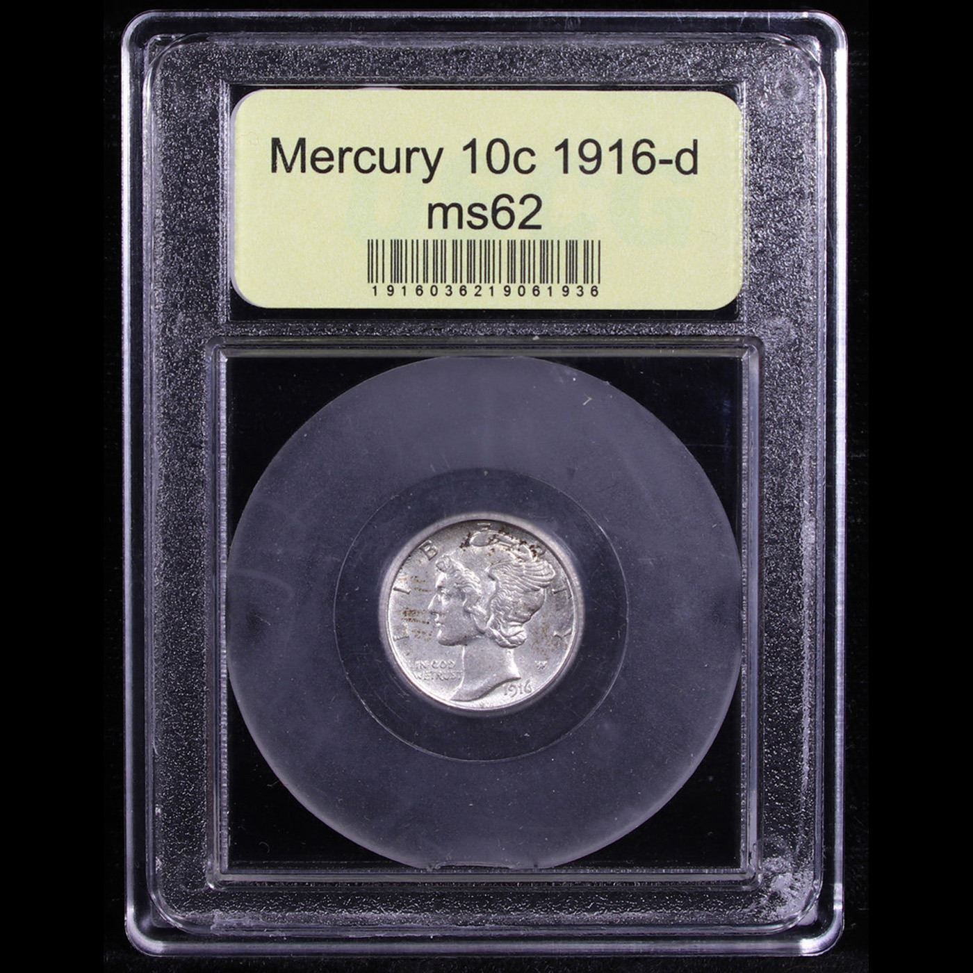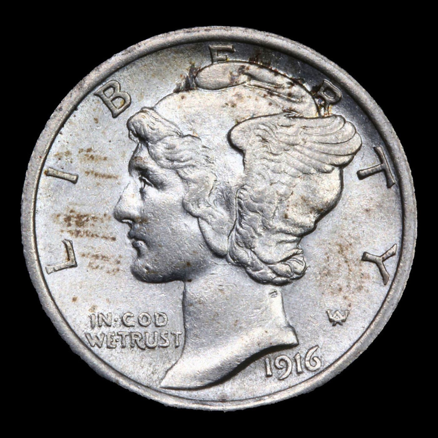 ***Auction Highlight*** 1916-d Mercury Dime 10c Graded Select Unc By USCG. HIGHLIGHT OF THE MONTH - Up for auction is a coin that usually comes between ag and vg. Up for auction is the legendary 1916-d Mercury Dime, but this time its in mint state ms62. At first glance this piece suggests a finer grade in terms of its overall appeal. The silvery surfaces are frosty, with cartwheel luster and a tinge of gold on each side. Under a high-power loupe, a few tiny areas of dark toning appear--on the obverse near the top rim and on the reverse tucked into some of the device crevices--but they are not readily visible otherwise. The horizontal bands are completely visible, but they are neither fully split nor totally rounded, the criteria for a Full Bands designation. This piece is nonetheless quite appealing and will fit well into a Mint State or high-grade circulated set also has a 45° CW Rotated die A Corey's Pick, Bid to Win, Don't let it get Away, you might not find its equal Coin. I give this coin my highest recommendation
