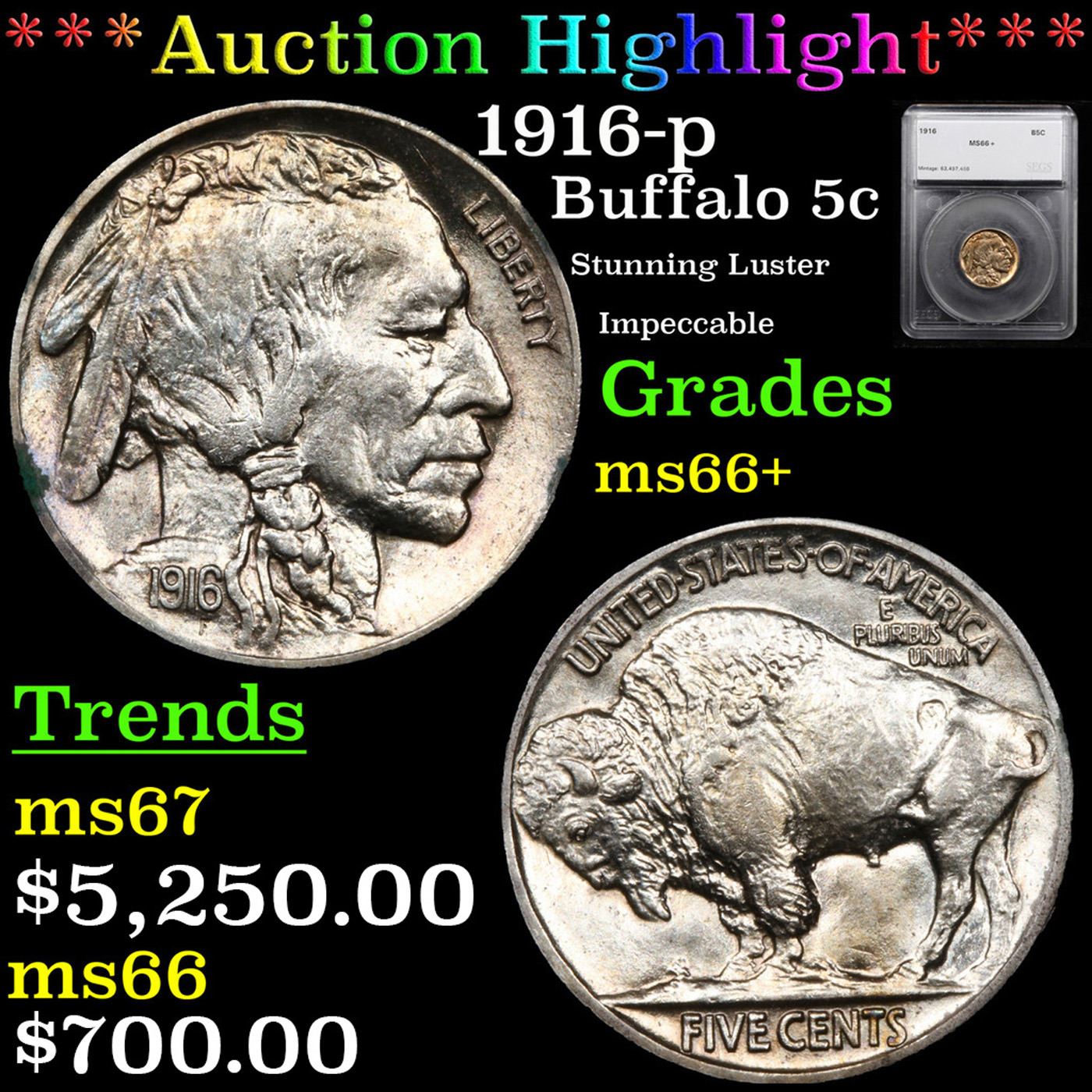 ***Auction Highlight*** 1916-p Buffalo Nickel 5c Graded ms66+ by SEGS.