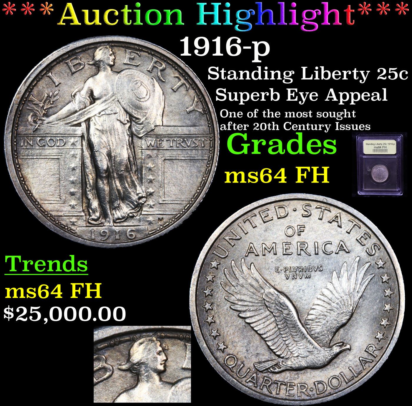 ***Auction Highlight*** 1916-p Standing Liberty Quarter 25c Graded Choice Unc FH By USCG. Here is a particularly desirable example of the key date 1916 Standing Liberty quarter issue. This coin offers superior technical quality and outstanding visual appeal. The strike is very full, with bold to sharp detail to virtually all design elements. Frosty luster swirls around both sides and blends nicely with champagne-pink toning. The smooth surfaces are suggestive of an even higher grade. The 52,000 1916-dated Standing Liberty quarters were struck late in the year and released in mid-January alongside the first 1917-dated quarters. As far more 1917 Type I quarters were struck, more of those were saved as keepsakes. The 1916 Standing Liberty quarter has become one of the most sought after 20th century U.S. Mint issues. This superior specimen is a premium quality coin for both the issue and the assigned grade and should attract very strong bidding A Corey's Pick, Bid to Win, Don't let it get Away, you might not find its equal Coin. I give this coin my highest recommendation