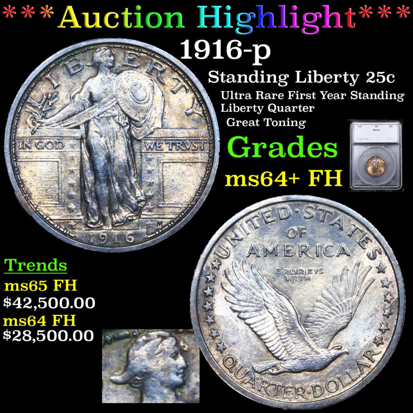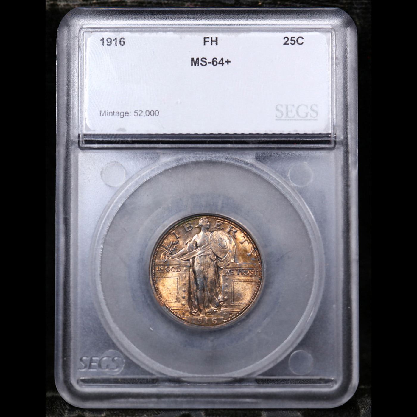 ***Auction Highlight*** 1916-p Standing Liberty Quarter 25c Graded ms64+ FH BY SEGS. The 1916 Standing Liberty quarter is the first issue in the series. These coins were not struck until the last two weeks of 1916, and they were released in January, 1917. The mintage is consequently very low, a mere 52,000 coins, making this issue the lowest mintage by far in the Standing Liberty quarter series and indeed one of the lowest mintage U.S. coins of the 20th century. The 1916 Standing Liberty quarter is rare in all grades and has always been a very high demand coin. Today, even extremely low grades sell in excess of $1,000 A Key Date's Pick, Bid to Win, Don't let it get Away, you might not find its equal Coin. I give this coin my highest recommendation