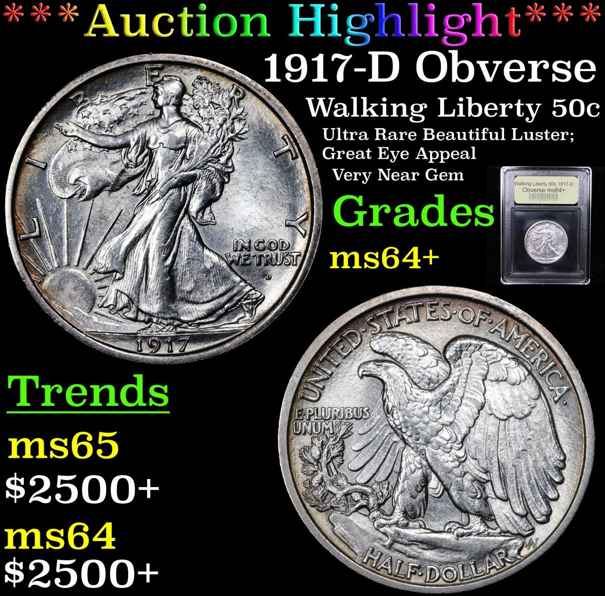 ***Auction Highlight*** 1917-D Obverse Walking Liberty Half Dollar 50c Graded Choice+ Unc By USCG (f