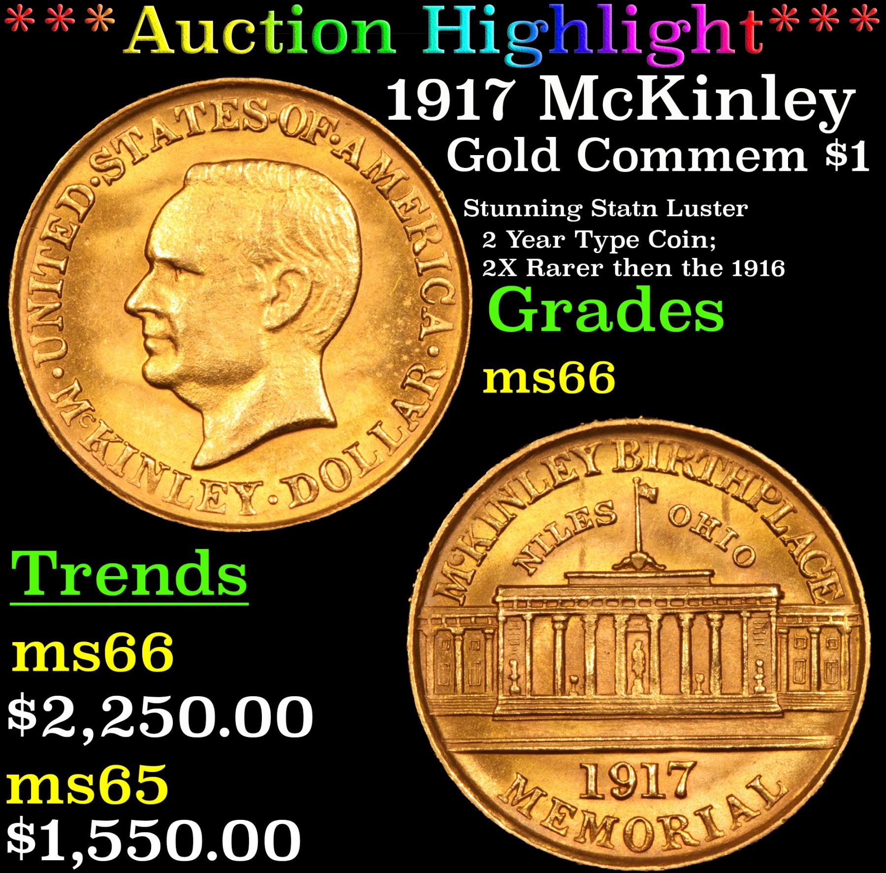 ***Auction Highlight*** 1917 McKinley Gold Commem Dollar .$1 Grades GEM+ Unc. Issued in 1917 on the 75th Anniversary of McKinley's Birth, but Due to His Untimely Demise by an Assassin, this Commemorative was Issued to Help Create a Memorial in his Hometown. When Examining a McKinley Commem, Points to Examine for the First Signs of Wear include McKinley�s Temple and the Hair Above His Ear; on the Reverse, Check the Pillar Above the Second Numeral 1 and the Base of the Flagpole. The 1917 is Much Scarcer with Q. David Bowers Estimating only 5,000 Pieces Were Ever Distributed! The estimated distribution for the 1917 McKinley gold dollar, per the Guide Book, was 5,000 coins compared to an estimated 10,000 pieces for the 1916. To be sure, this is the scarcer issue in high grades. Vivid rose-orange patina blends with vibrant satin luster on both sides of this simply outstanding Gem. From the second of two years of the type, and somewhat scarcer than the 1916 issue. A Corey's Pick