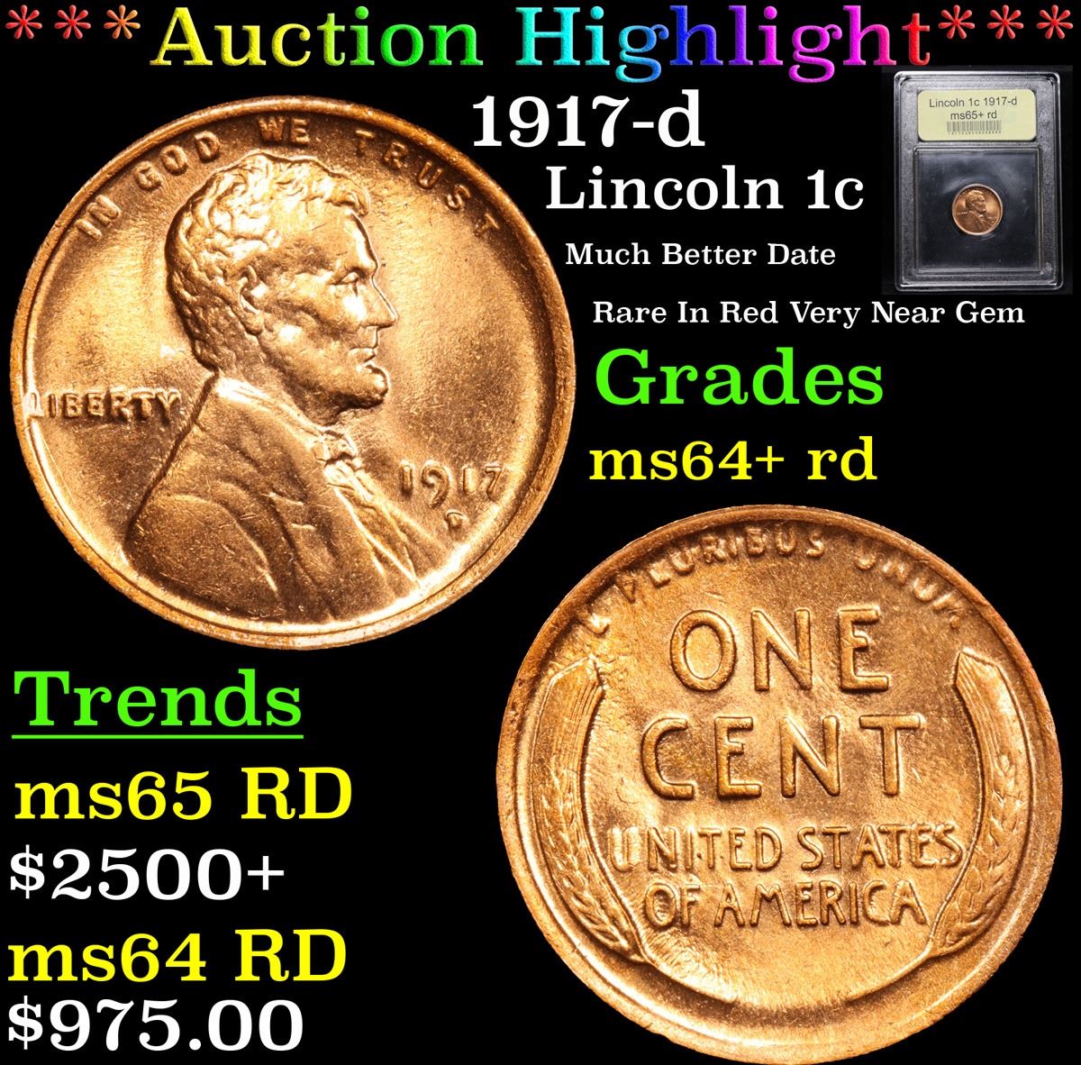 ***Auction Highlight*** 1917-d Much Better Date Rare In Red Lincoln Cent 1c Graded Gem+ Unc RD By USCG. Beautiful Gem example. Super eye appeal. A Corey's Pick, Bid to Win, Don't let it get Away Coin