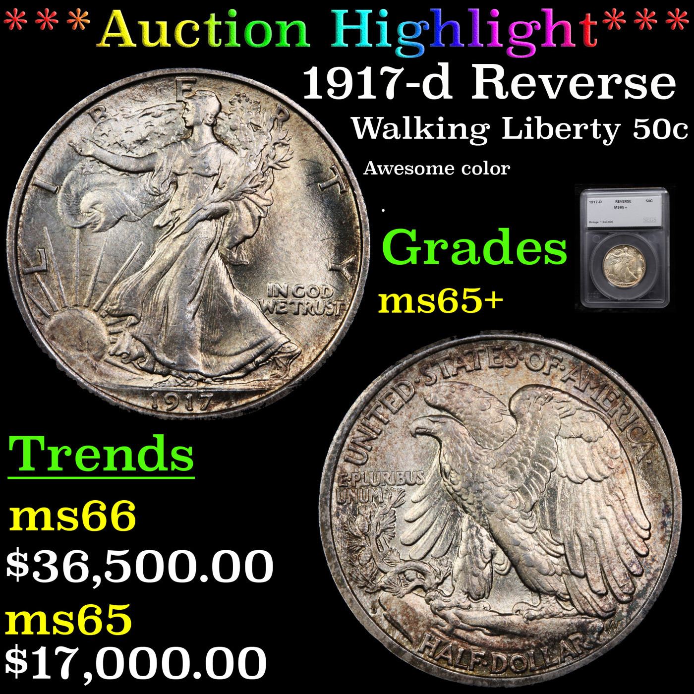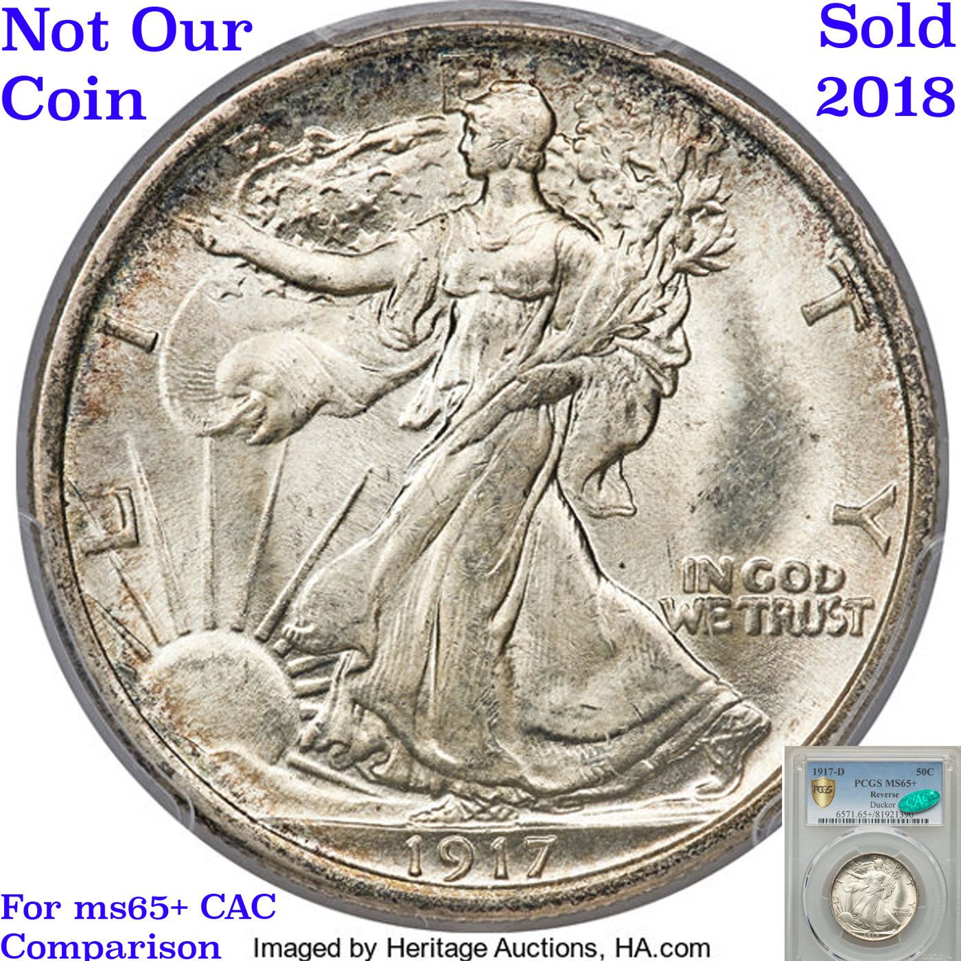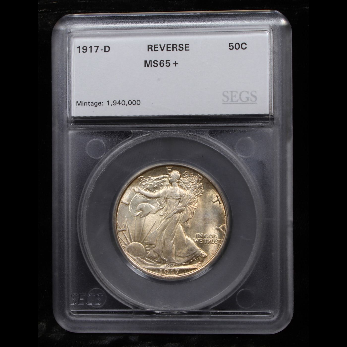 ***Auction Highlight*** 1917-d Reverse Walking Liberty Half Dollar 50c Graded ms65+ By SEGS. Rich, mottled, patina provides a wonderfully original appearance for this handsome piece. Well struck with predominantly sharp detail, the surfaces are uncommonly well preserved for this conditionally challenging issue. In 1917 the mintmarks on half dollars were found on both the obverse and the reverse, though beginning in 1918 they were placed on the reverse only, remaining there through the Franklin half dollar series. Though the 1917-D half dollar with reverse mintmark is somewhat more available in circulated grades than its obverse mintmark counterpart, in Mint State grades the reverse mintmark style is considerably scarcer and more desirable, especially in MS-65, as here. Those seeking a beautiful high grade example need look no further. I am including another ms65+ for your comparison. Nte how much more superior our strike is. A Corey's Pick, Bid to Win, Don't let it get Away, you might not find its equal Coin. I give this coin my highest recommendation