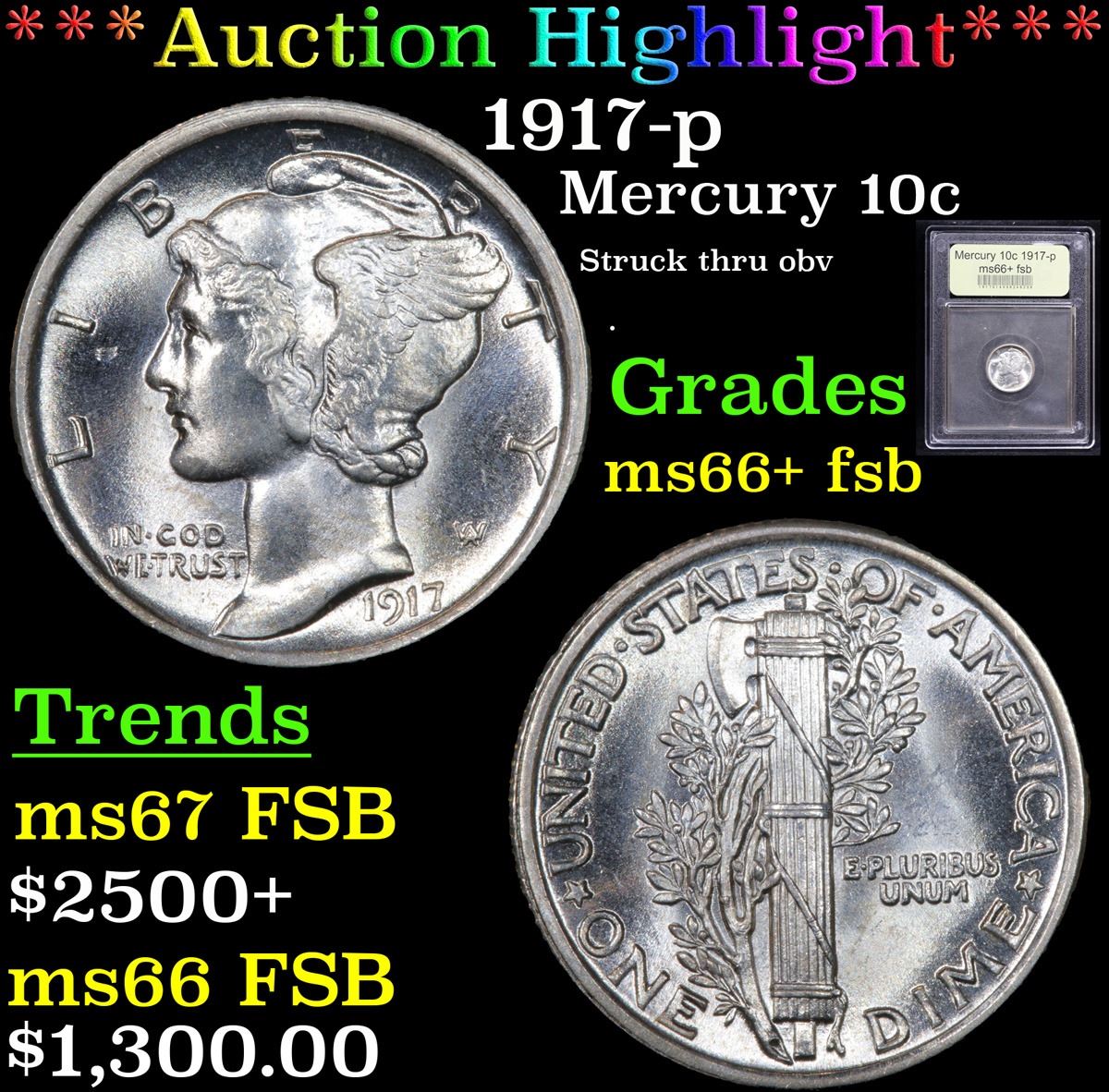 ***Auction Highlight*** 1917-p Struck thru obv . Mercury Dime 10c Graded GEM++ FSB By USCG. A Corey's Pick, Bid to Win, Don't let it get Away, you might not find its equal Coin