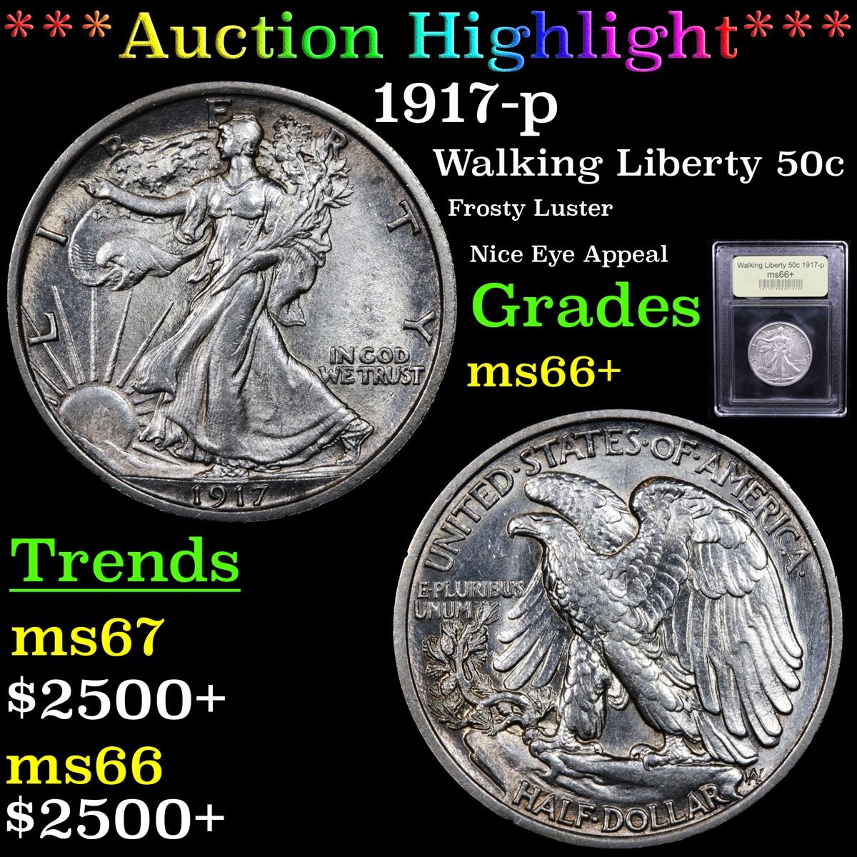 ***Auction Highlight*** 1917-p Walking Liberty Half Dollar 50c Graded GEM++ Unc By USCG. Frosty luster and virtually untoned surfaces are among the attributes this high-end Premium Gem representative possesses. The design elements exhibit a pleasing degree of definition A Corey's Pick, Bid to Win, Don't let it get Away, you might not find its equal Coin. I give this coin my highest recommendation