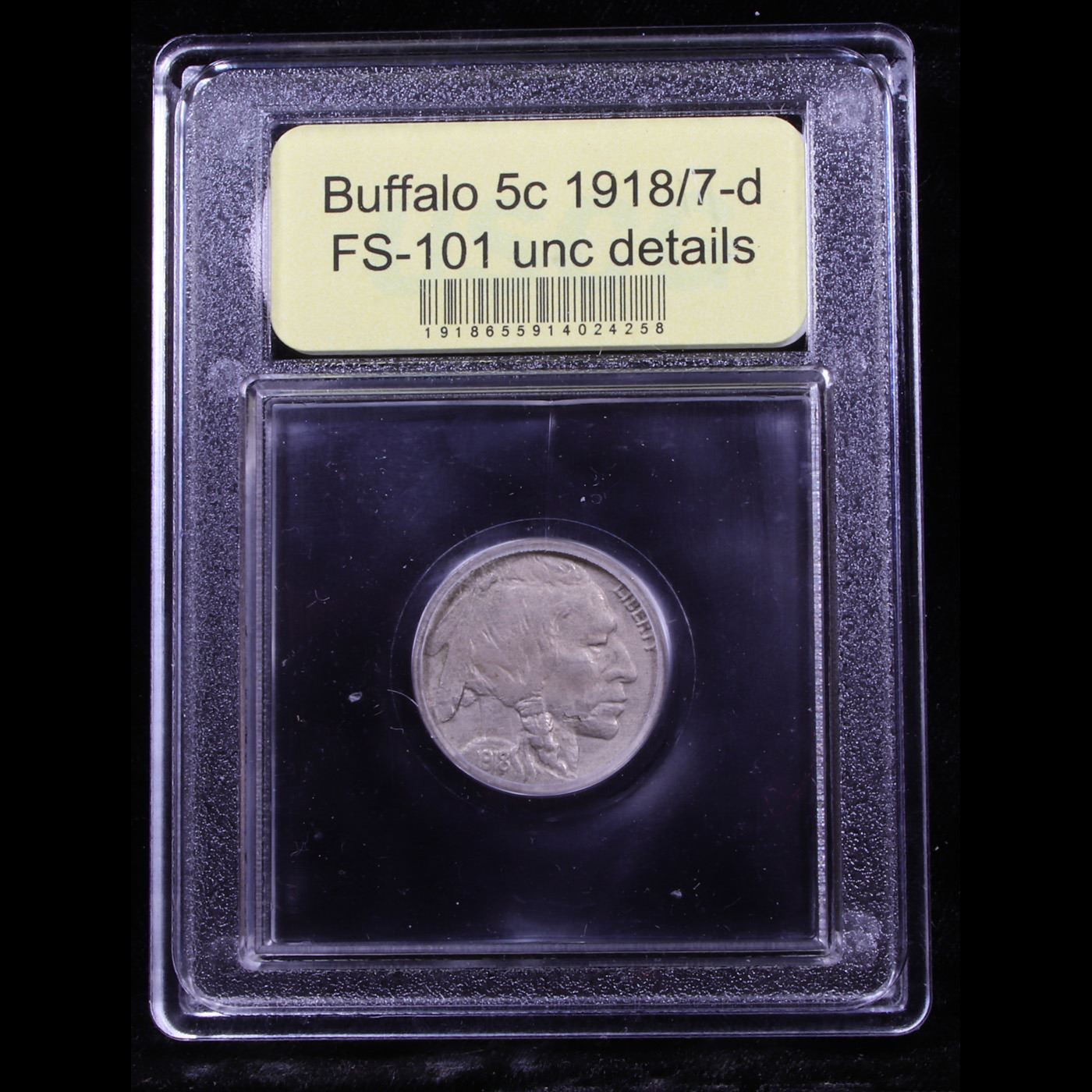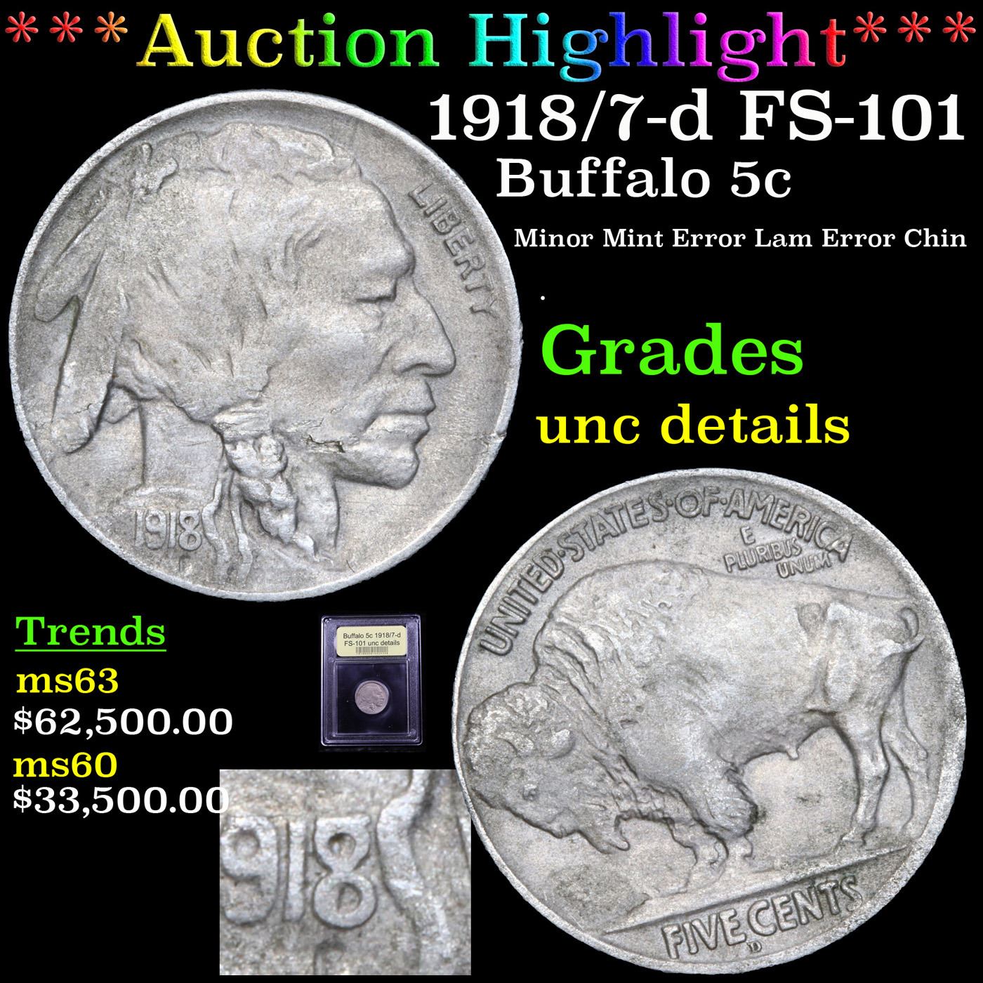 ***Auction Highlight*** 1918/7-d FS-101 Buffalo Nickel 5c Graded Unc Details By USCG. Most 1918-7-D nickels are in circulated grades. The present friction-free example shows the under digit 7 as it initially left the Mint. It has slightly lower relief than the over digit 8, which makes the upper right corner and the upper half of the downstroke even more distinct. This attribute is lost on circulated pieces, since the date is exposed and wears quickly. This nicely struck representative exhibits matte surfaces and lacks relevant marks. The surfaces are granular. A Corey's Pick, Bid to Win, Don't let it get Away, you might not find its equal Coin. I give this coin my highest recommendation