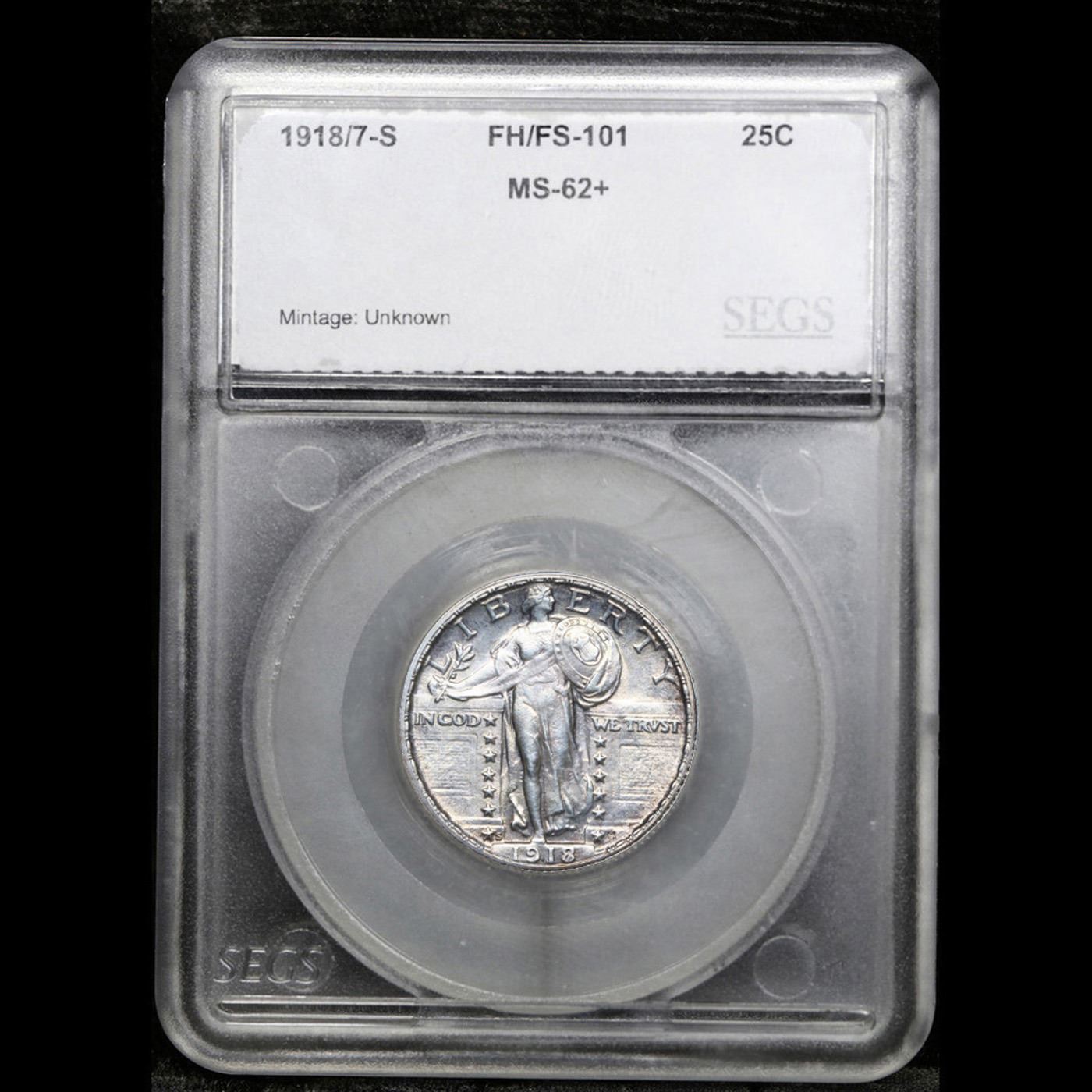 ***Auction Highlight*** 1918/7-s FS-101 Standing Liberty Quarter 25c Graded ms62+ FH By SEGS. Only Full Head 18/7-s to come to auction since 2020. Per David Hall Of PCGS " The 1918/7-S Standing Liberty quarter is one of the key date silver coin rarities of the 20th century. This variety was first noticed in the late 1930's and the first auction appearance was in December, 1937. Collectors began saving the few they could find in circulation. Today, the 1918/7-S is rare and relatively expensive even in the lowest grades. Mint state specimens are very rare and specimens with fully struck heads are extremely rare. Probably less than 100 mint state survivors exist and there are probably less than 10 gem MS65 or better specimens. There are only a handful of full head specimens and, as far as I know, there are no Gem MS65 full head specimens" A Corey's Pick, Bid to Win, Don't let it get Away, you might not find its equal Coin. I give this coin my highest recommendation