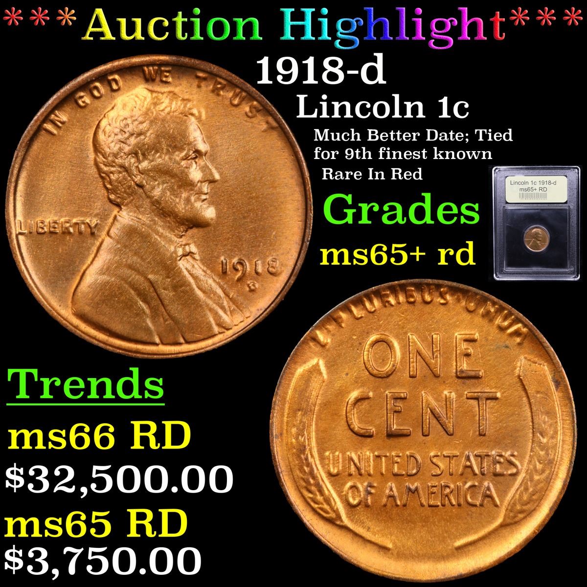 ***Auction Highlight*** 1918-d Lincoln Cent 1c Graded Gem+ Unc RD By USCG. This is a highly significant offering for the advanced Lincoln cent collector, a true condition rarity in a survivor of the 1918-D. Both sides retain full, vivid mint color, the obverse with warm peach-orange and the reverse dressed in slightly deeper tangerine hues. The strike is a bit weak,. Matte-like texture in the fields delightful devices. A substantial mintage of 47,830,000 pieces conceals the rarity of the 1918-D in Uncirculated condition. Even in lower Mint State grades this issue is relatively scarce, while in Gem full Red it is rare. A mere eight examples grade finer at PCGS, through MS-67. A Corey's Pick, Bid to Win, Don't let it get Away, you might not find its equal Coin. I give this coin my highest recommendation