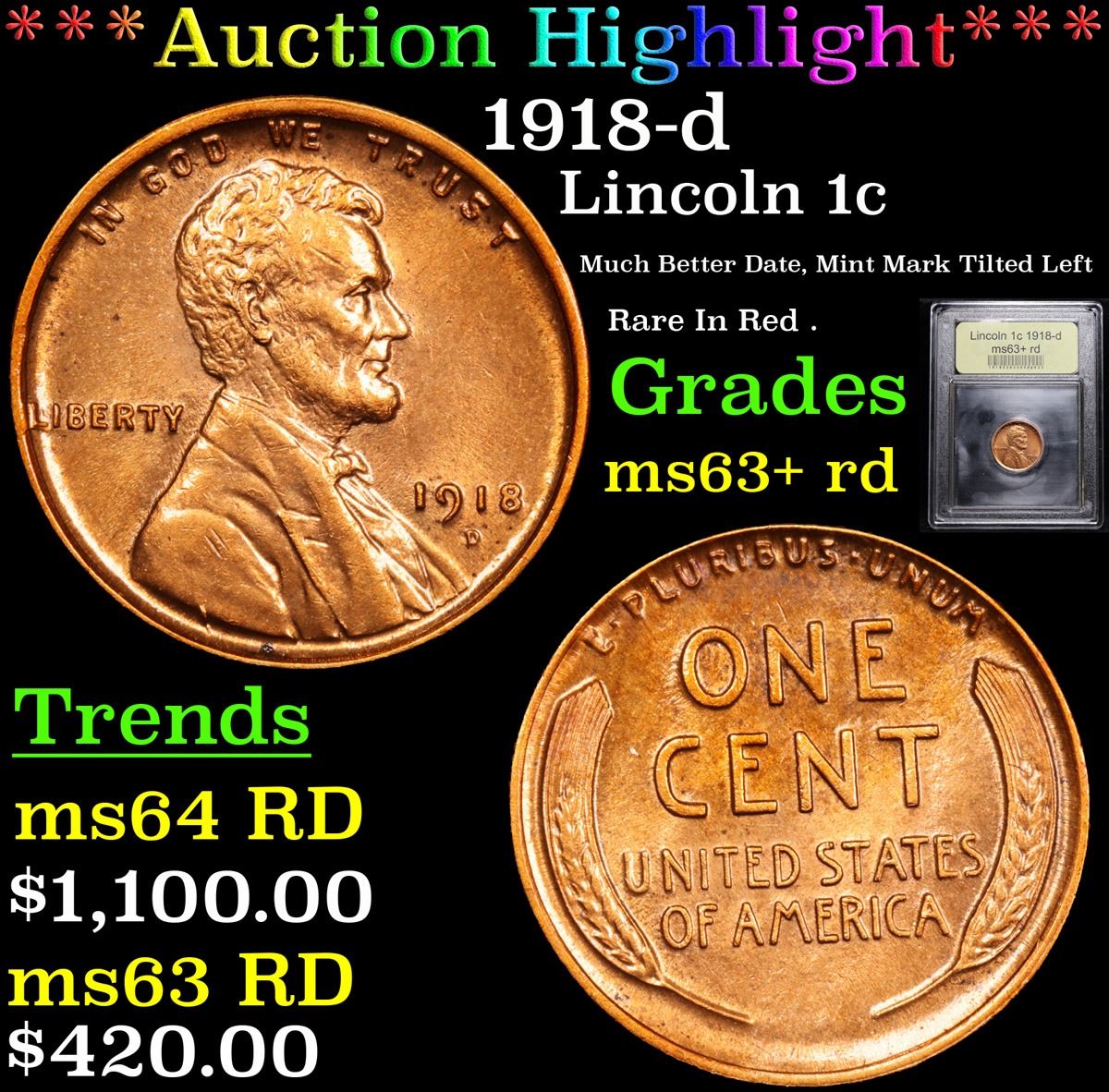 ***Auction Highlight*** 1918-d Much Better Date, Mint Mark Tilted Left Rare In Red . Lincoln Cent 1c Graded Select+ Unc RD By USCG. A Corey's Pick, Bid to Win Coin