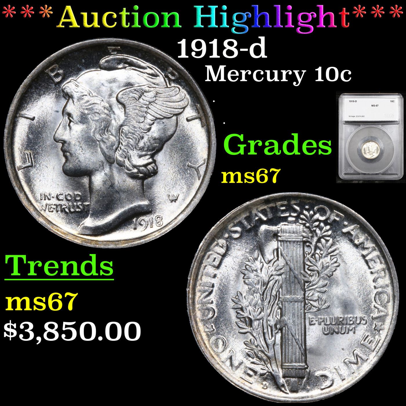 ***Auction Highlight*** 1918-d Mercury Dime 10c Graded ms67 By SEGS.