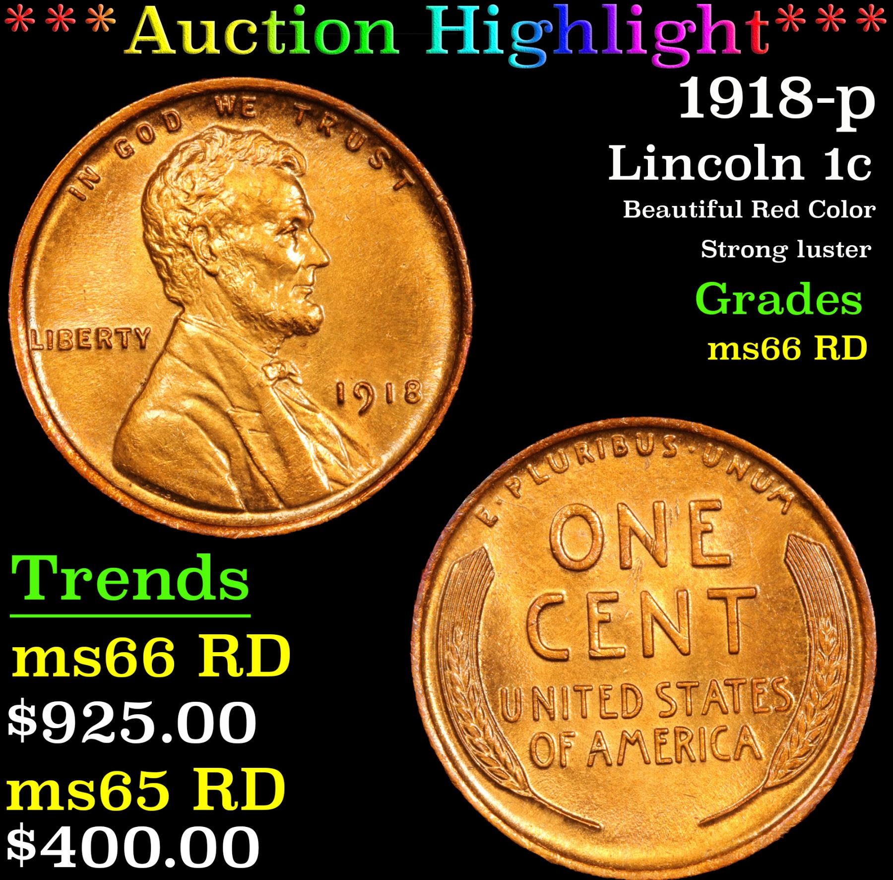 ***Auction Highlight*** 1918-p Lincoln Cent 1c Graded GEM+ Unc RD By USCG. With an original mintage of over 288 million pieces, PCGS estimates that only 1200 remain in ms65 or better. Beautiful Red Color
