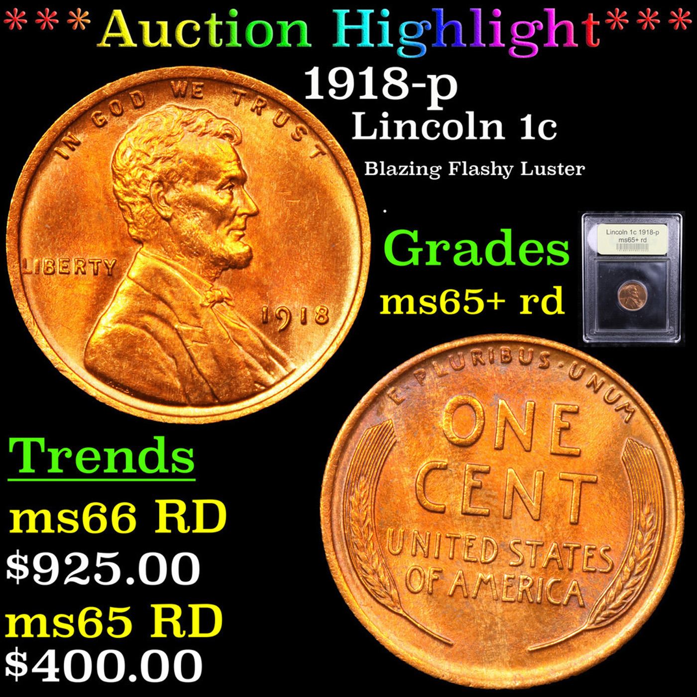 ***Auction Highlight*** 1918-p Lincoln Cent 1c Graded Gem+ Unc RD By USCG.