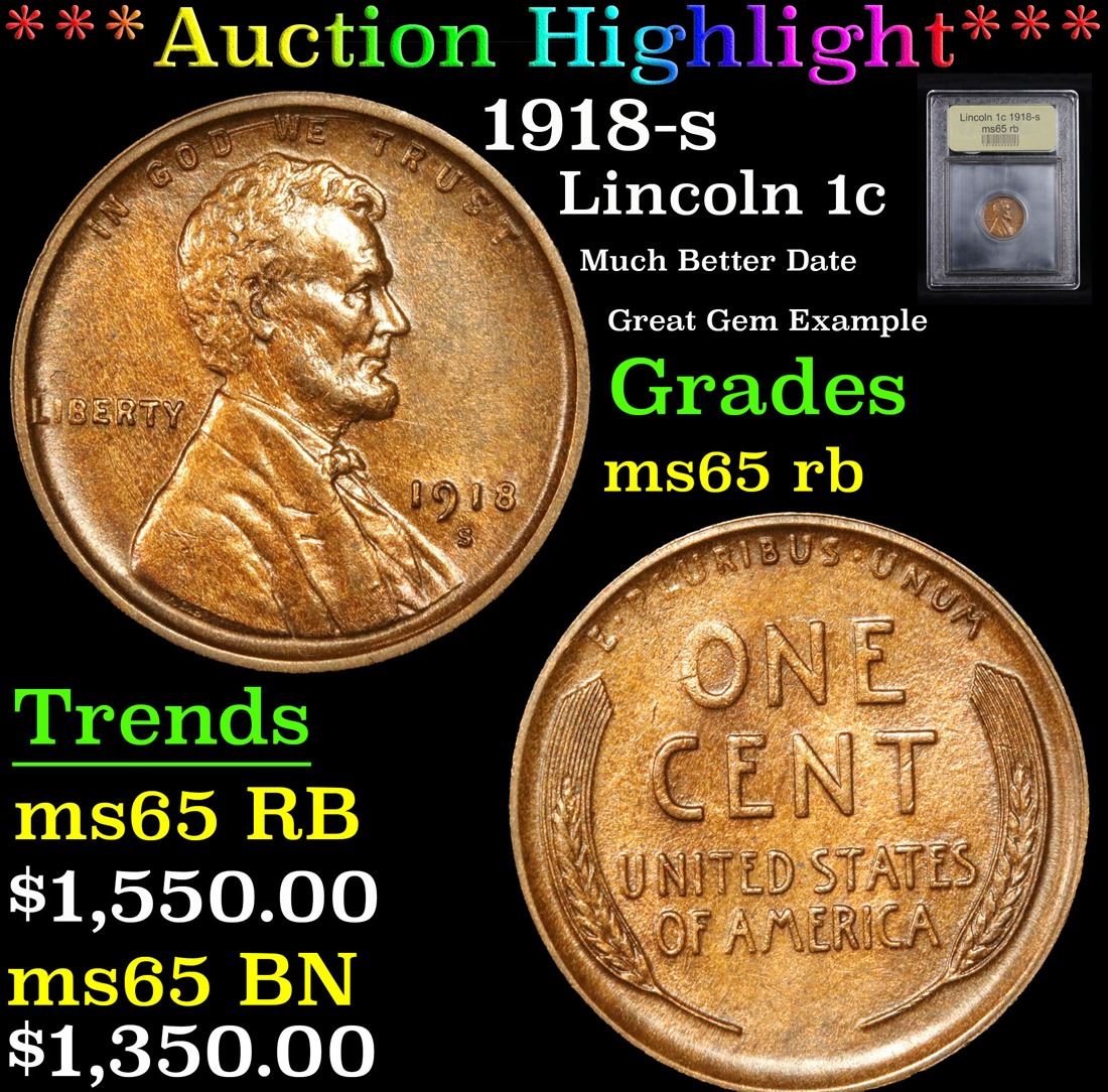 ***Auction Highlight*** 1918-s Lincoln Cent 1c Graded GEM Unc RB By USCG. Much Better Date Great Gem Example