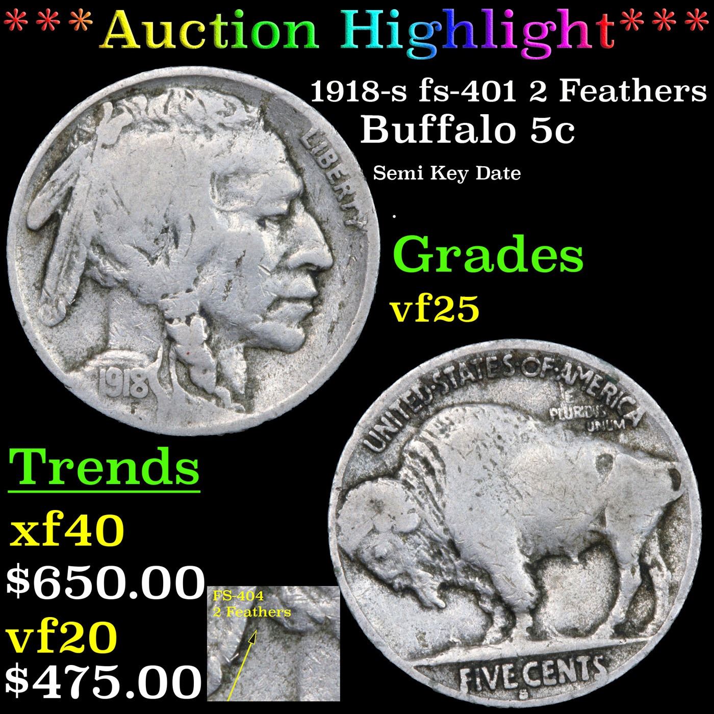 ***Auction Highlight*** 1918-s fs-401 2 Feathers Buffalo Nickel 5c Grades vf+.