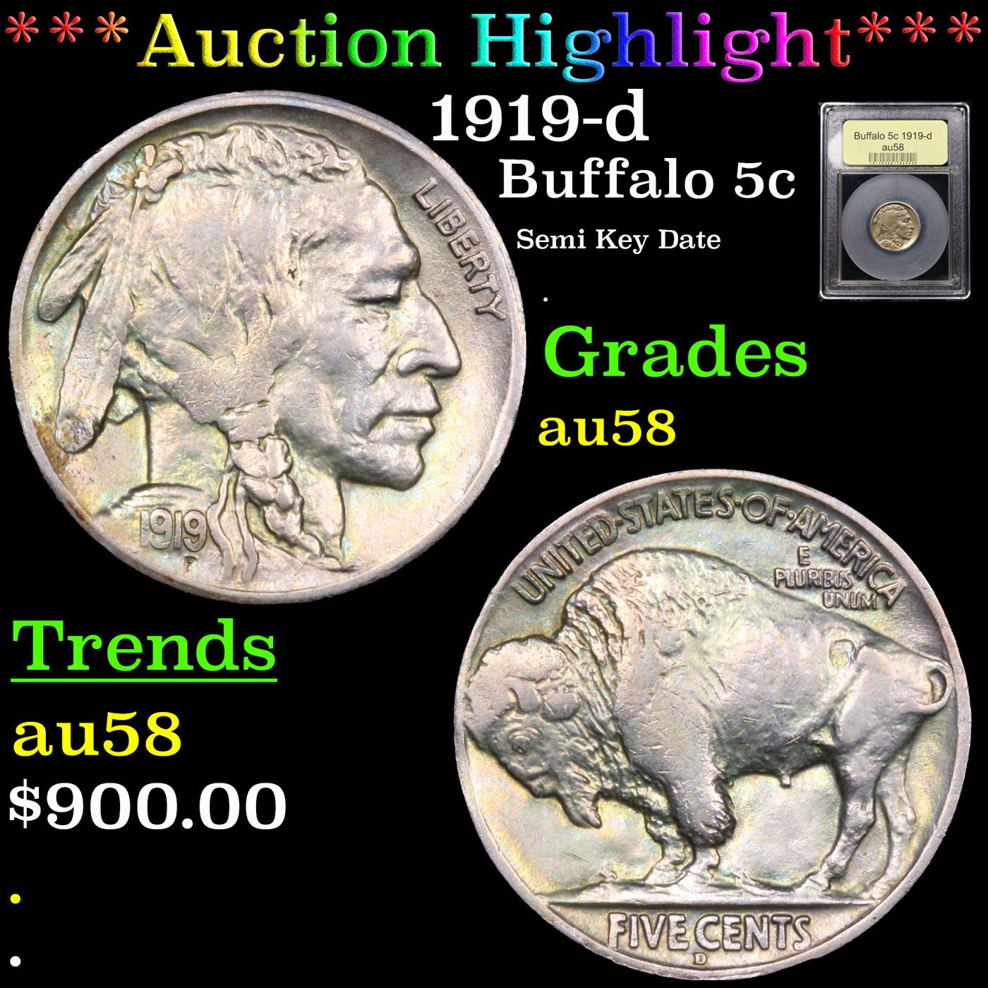 ***Auction Highlight*** 1919-d Buffalo Nickel 5c Graded Choice AU/BU Slider BY USCG. A Key Date's Pick, Bid to Win Coin