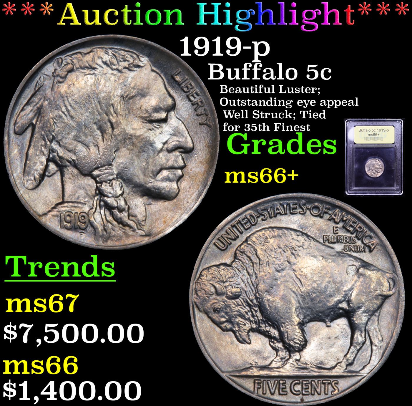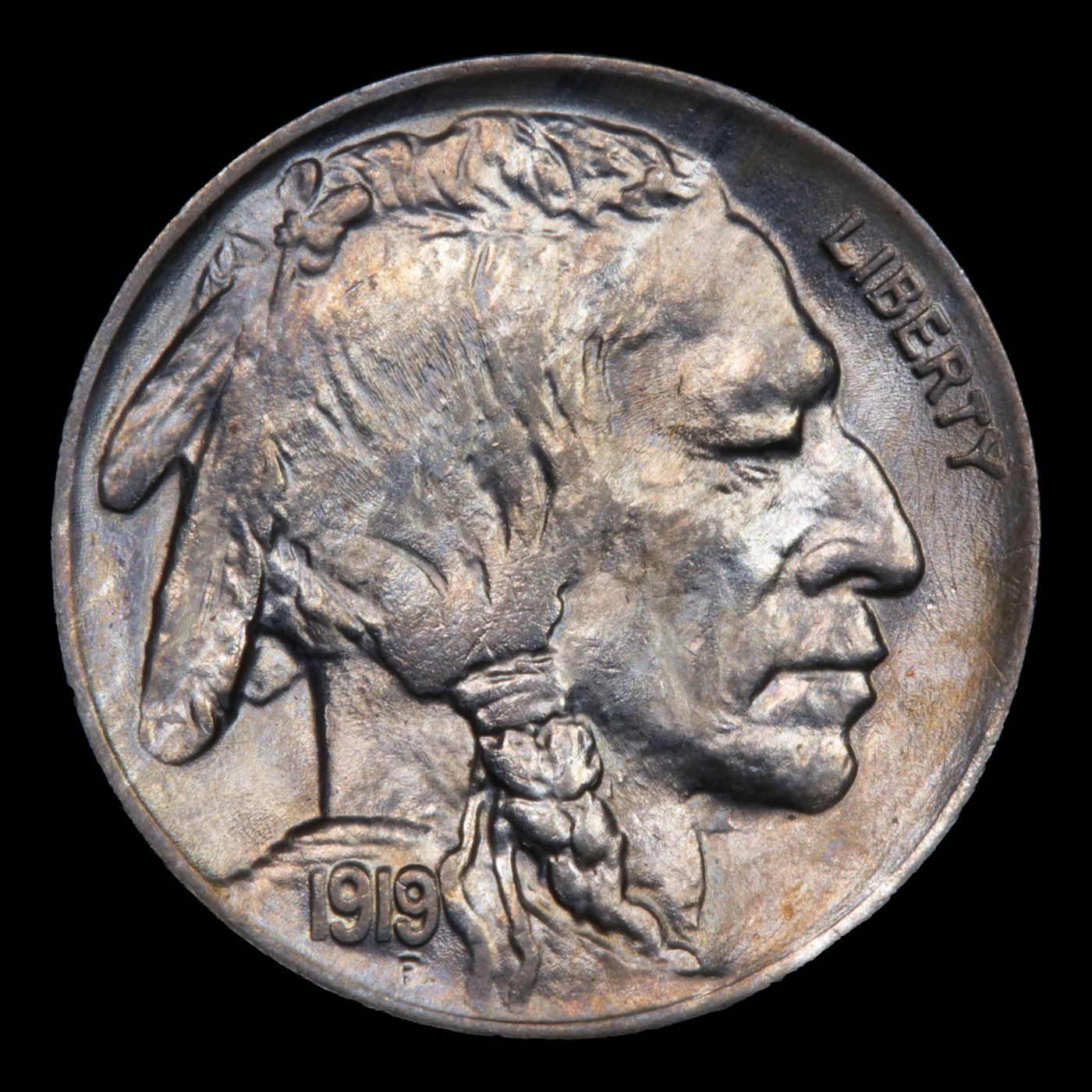 ***Auction Highlight*** 1919-p Buffalo Nickel 5c Graded GEM++ Unc By USCG. Golden-brown patina graces this pristine Superb Gem. Only the hair above the braid lacks a full strike. A colorful and beautiful example of an issue seldom seen in such remarkable quality. A Corey's Pick, Bid to Win, Don't let it get Away, you might not find its equal Coin