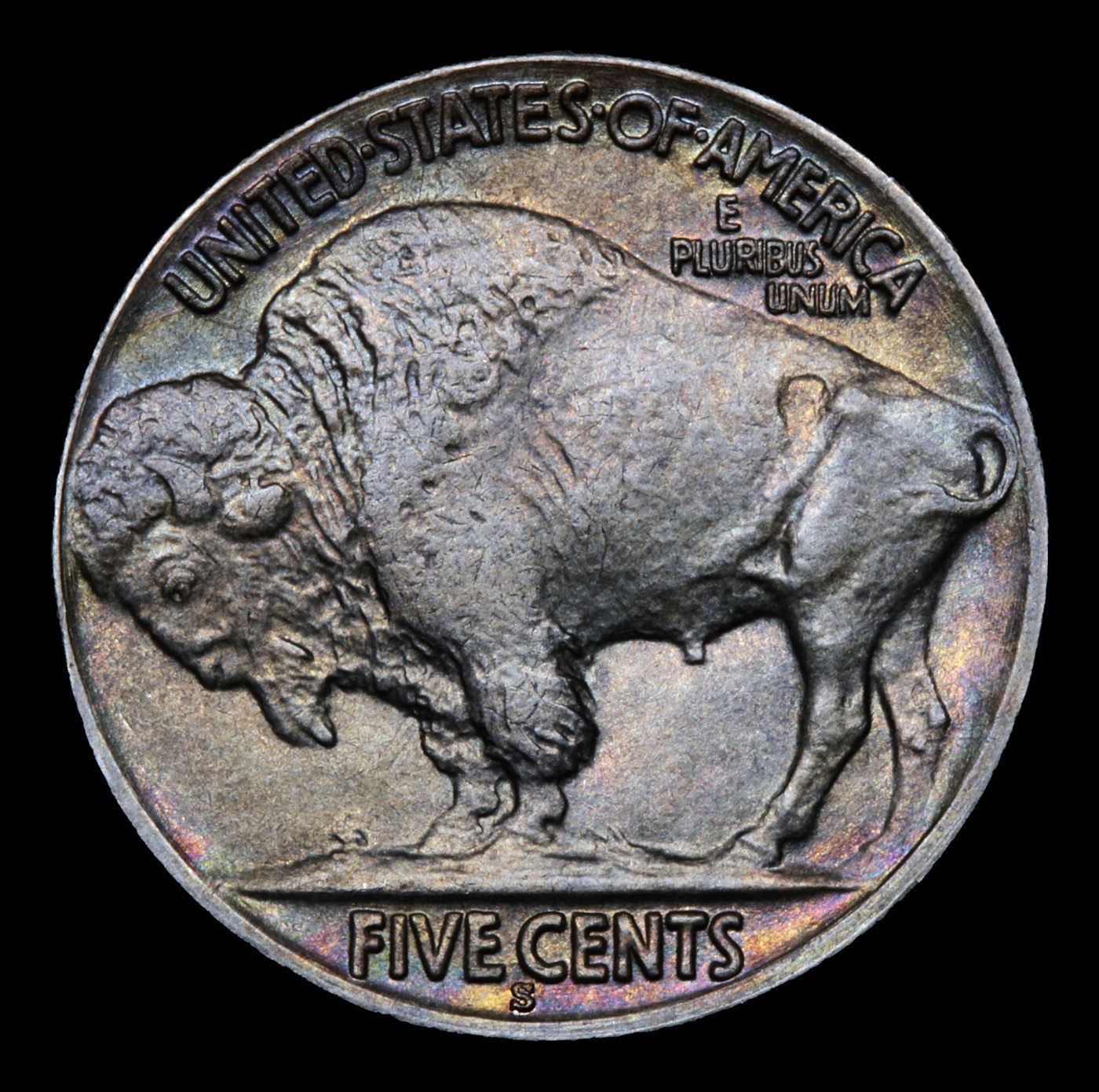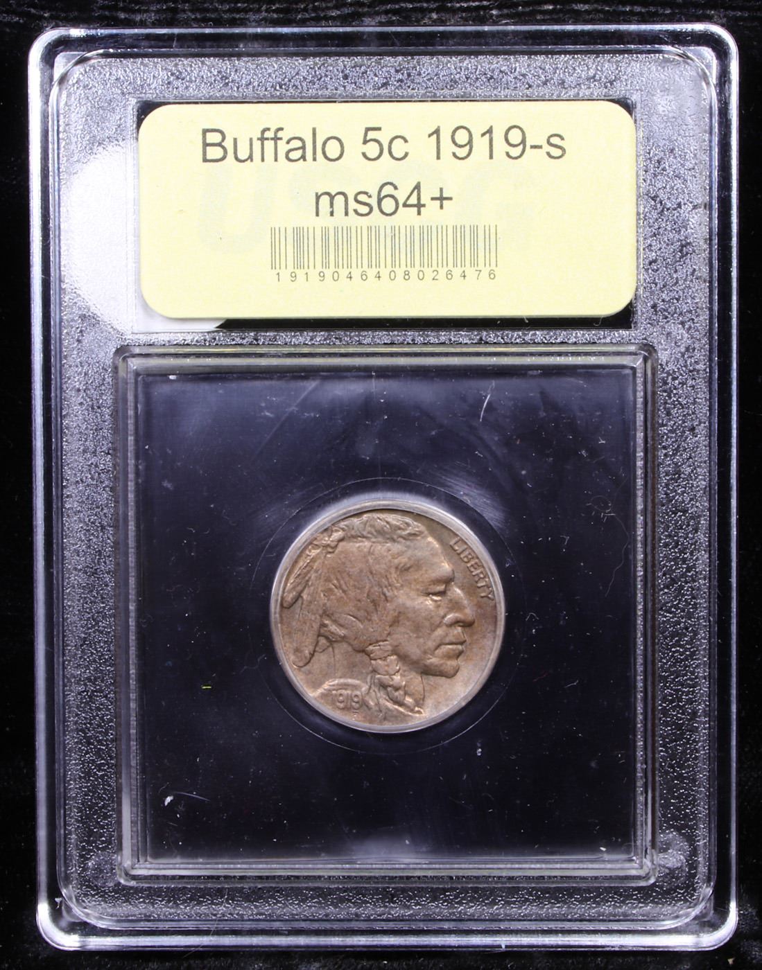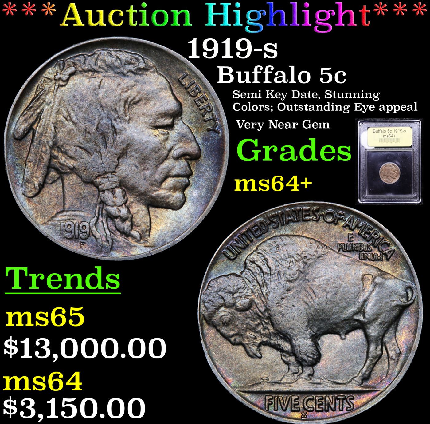 ***Auction Highlight*** 1919-s Buffalo Nickel 5c Graded Choice+ Unc BY USCG. According to David Hall, the 1919-s is scarce in circulated grades. Most of the killer rarities in the Buffalo nickel series are the 1918 thru 1927 San Francisco issues. The 1919-S Buffalo nickel is not difficult to locate in MS64 condition, but examples with a sharp strike are quite elusive. This attractive Plus-graded Choice specimen offers unusually sharp design elements and well-preserved lustrous surfaces, under vivid shades of ice-blue and greenish-gold toning A Corey's Pick, Bid to Win, Don't let it get Away, you might not find its equal Coin. I give this coin my highest recommendation