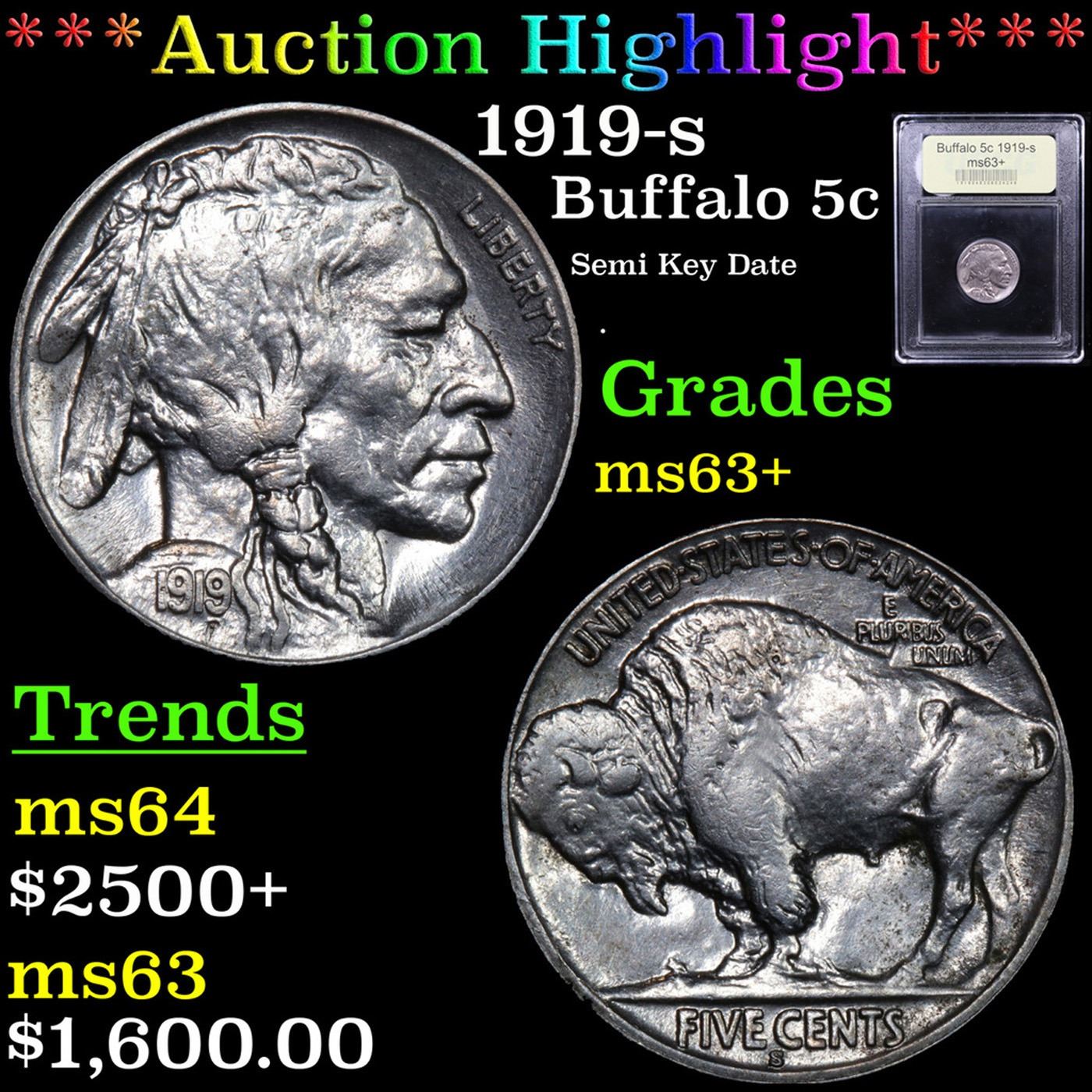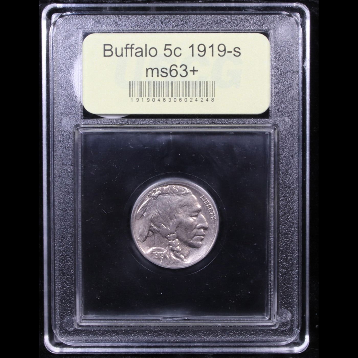 ***Auction Highlight*** 1919-s Buffalo Nickel 5c Graded Select+ Unc By USCG. According to David Hall, the 1919-s is scarce in circulated grades. Most of the killer rarities in the Buffalo nickel series are the 1918 thru 1927 San Francisco issues. Up for Auction is the rare 1919-s Buffalo Nickel. Central striking detail is bold, and that around the peripheries only marginally less so. Soft satin luster is seen throughout. A heavily circulated issue, the 1919-S is scarce to rare in all grades above VF. Given the extreme rarity of Gems, this well produced and preserved MS-63+ is sure to appeal to astute Buffalo nickel enthusiasts. A Corey's Pick, Bid to Win, Don't let it get Away Coin