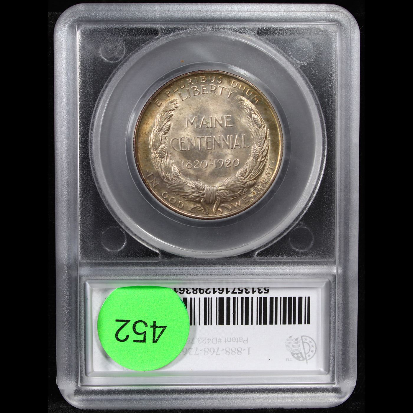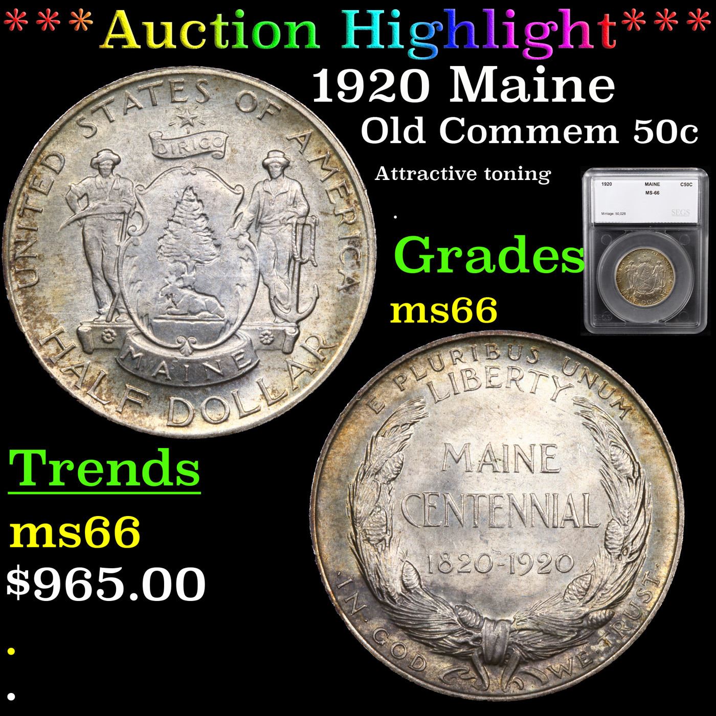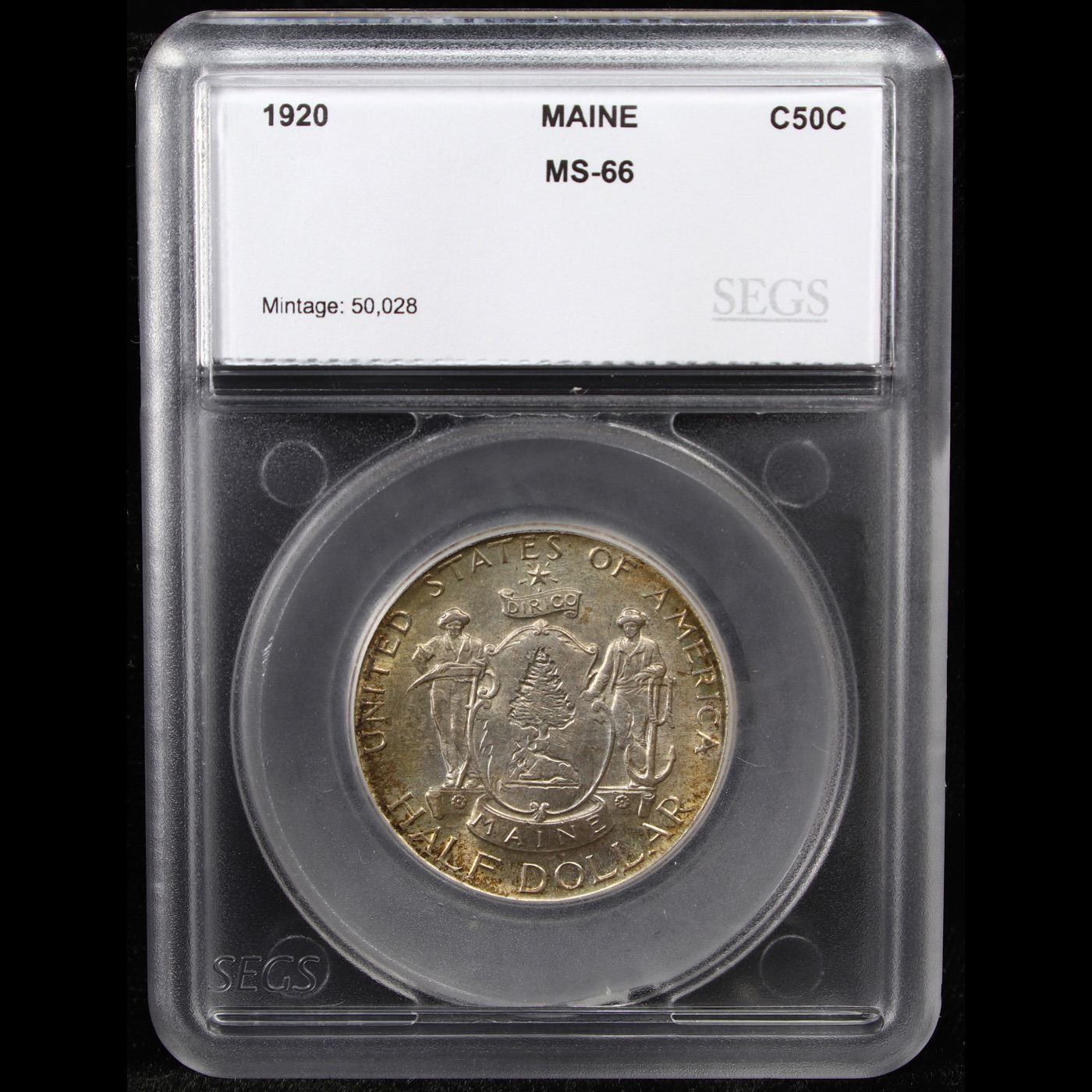 ***Auction Highlight*** 1920 Maine Old Commem Half Dollar 50c Graded ms66 By SEGS. When looking at a Maine Commemorative, wear First Appears on the Hands Adjacent to the Escutcheon and on the Wreath’s Bow Knot.