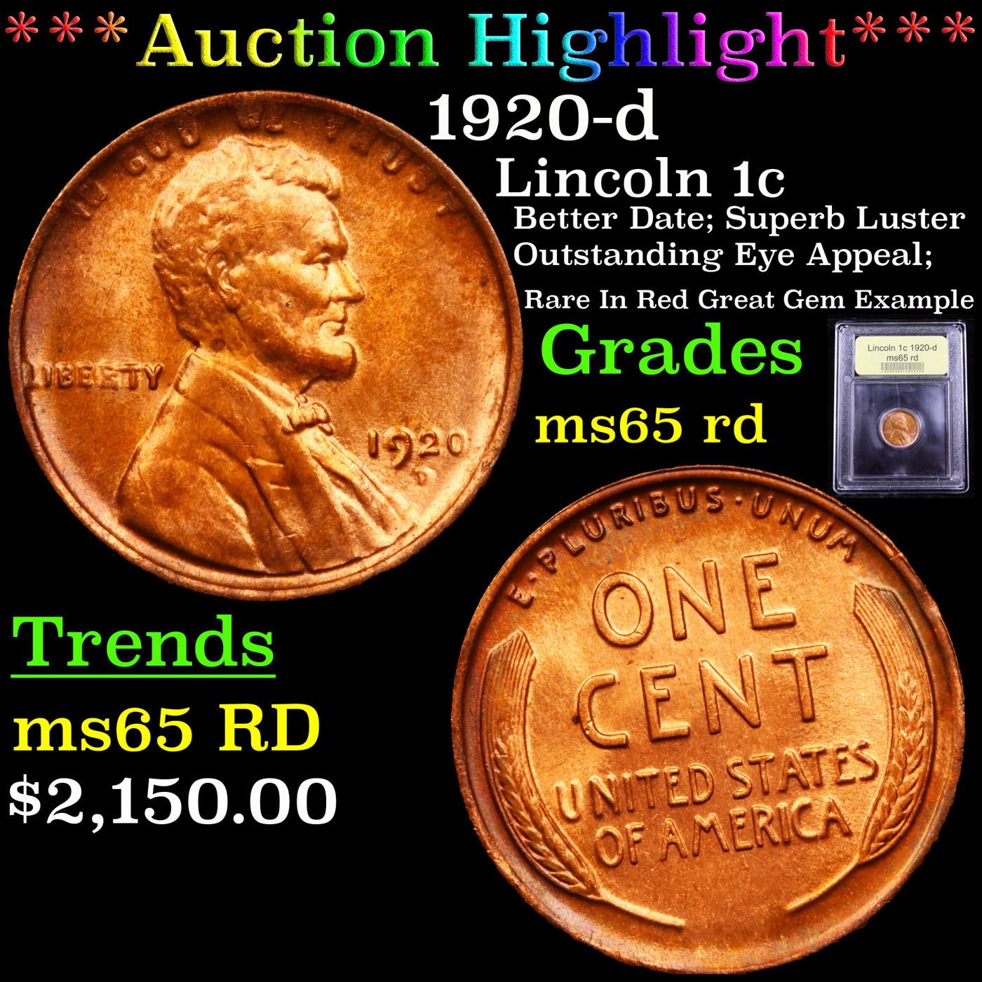 ***Auction Highlight*** 1920-d Lincoln Cent 1c Graded GEM Unc RD By USCG. A Corey's Pick, Bid to Win, Don't let it get Away Coin