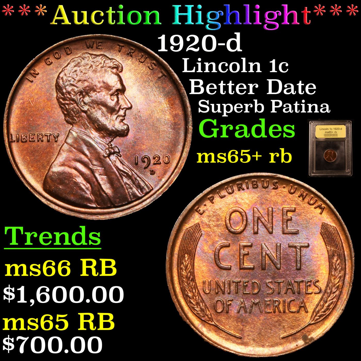 ***Auction Highlight*** 1920-d Lincoln Cent 1c Graded Gem+ Unc RB By USCG. A Corey's Pick, Bid to Win Coin