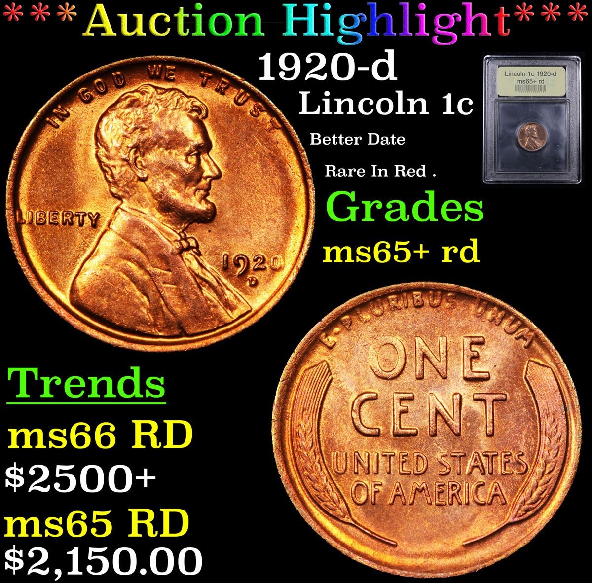 ***Auction Highlight*** 1920-d Lincoln Cent 1c Graded Gem+ Unc RD By USCG. A Corey's Pick, Bid to Win, Don't let it get Away, you might not find its equal Coin. I give this coin my highest recommendation