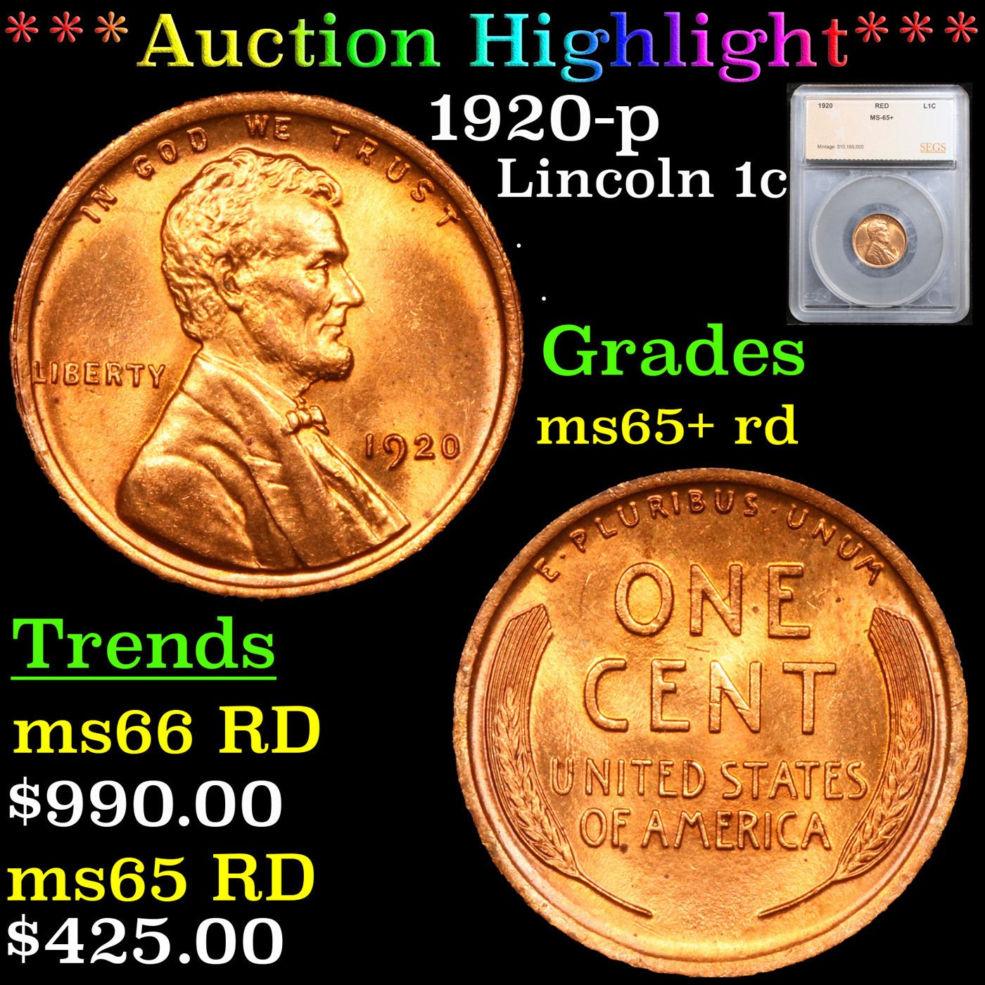 ***Auction Highlight*** 1920-p Lincoln Cent 1c Graded ms65+ rd By SEGS.