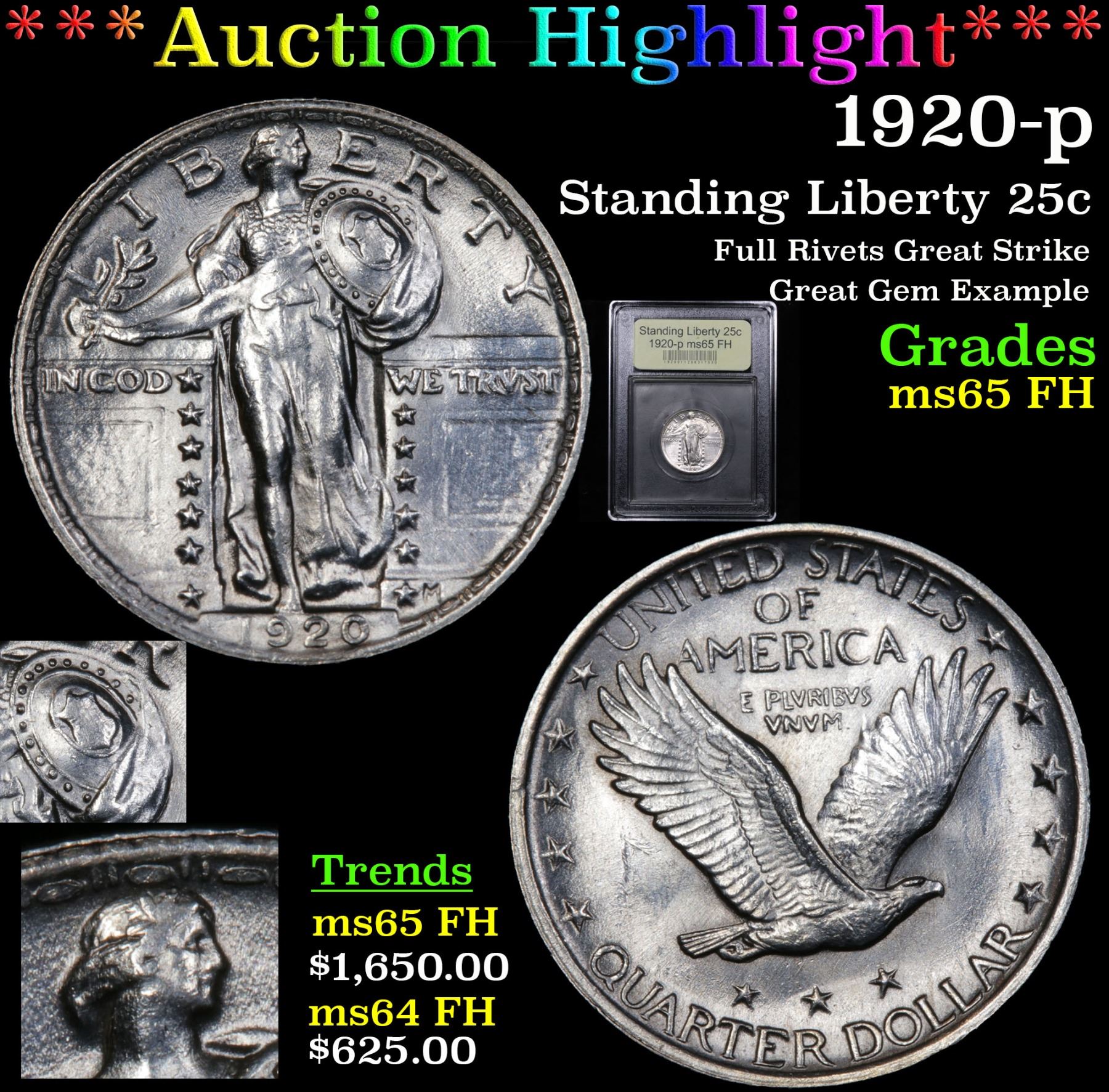 ***Auction Highlight*** 1920-p Full Rivets Great Strike Great Gem Example Standing Liberty Quarter 25c Graded GEM FH By USCG. A Corey's Pick, Bid to Win, Don't let it get Away Coin