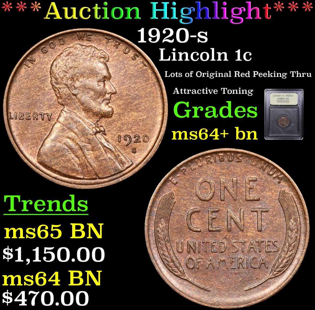 ***Auction Highlight*** 1920-s Lots of Original Red Peeking Thru Attractive Toning Lincoln Cent 1c Graded Choice+ Unc BN By USCG. A Corey's Pick, Bid to Win Coin