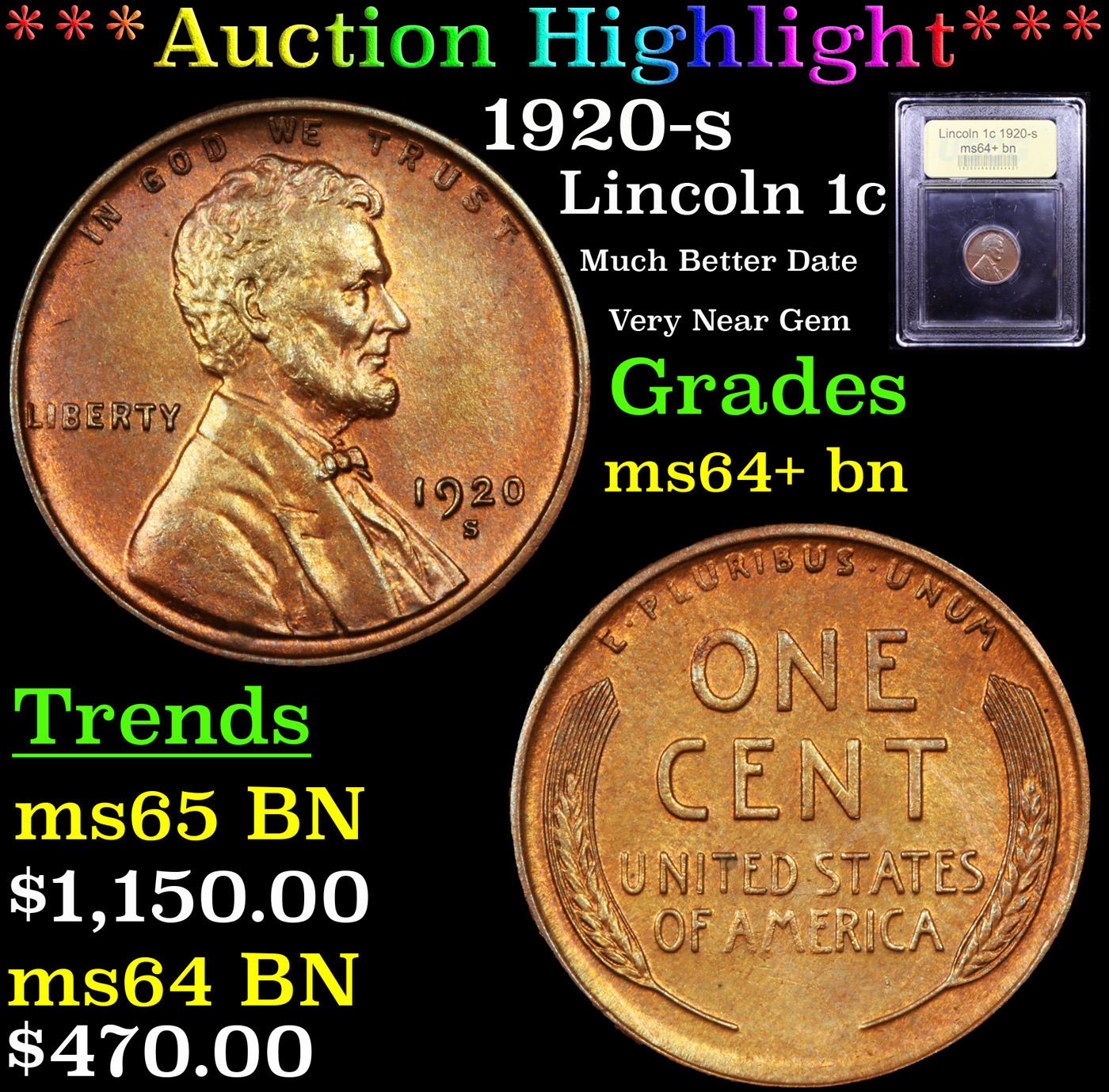 ***Auction Highlight*** 1920-s Lincoln Cent 1c Graded Choice+ Unc BN By USCG. A Corey's Pick, Bid to Win Coin