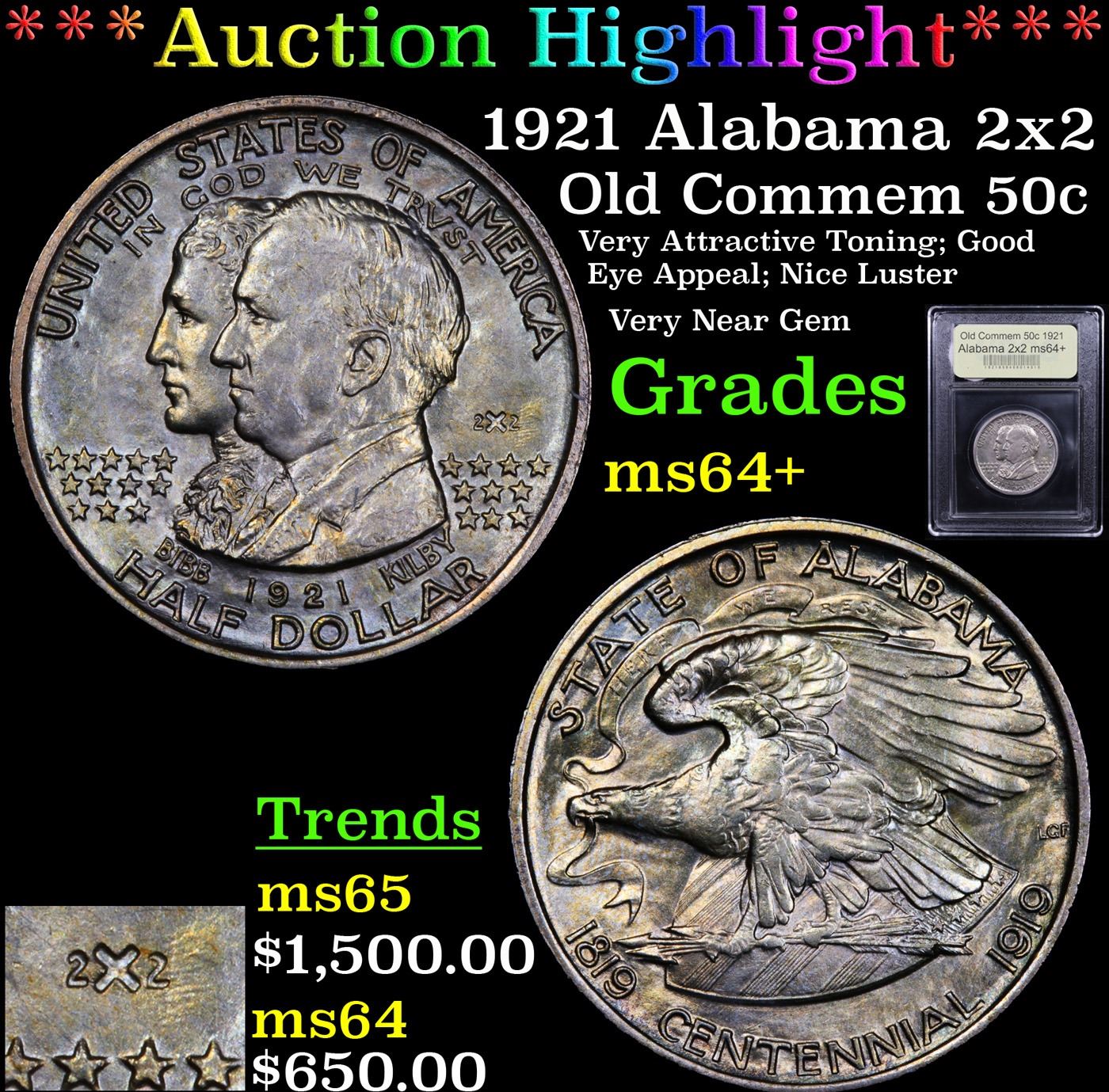 ***Auction Highlight*** 1921 Alabama 2x2 Old Commem Half Dollar 50c Graded Choice+ Unc By USCG. Uncirculated Examples will still Posses Luster on the Higher Points of the Design, namely on Kilby’s Upper Ear and on the Eagle’s Breast, Leg and Talons. Wear First Appears on Kilby's Forehead and Cheek and on the Eagle's Neck, Wingtip and Upper Edge of its Wing. Only 10% of the Issue was Made with the 2x2 Mark. Up for auction is the rare Alabama 2x2 variety. 1921 Alabama Centennial commemorative half-dollars were designed by Laura Gardin Fraser and have two variants. One is the normal “plain” variety and the other one has a sunken “2X2” in the right field above the stars. This was to note Alabama’s status as the 22nd state of the Union and to create an additional version for collectors, and in turn, increased revenues.The issue is notable for its obverse design, which includes the busts of William Wyatt Bibb, Alabama’s first governor, and T. E. Kilby, who was then-governor of Alabama. The depiction of Kilby marked the first use of a recognizable living person’s portrait on a U.S. coin. A Corey's Pick, Bid to Win, Don't let it get Away Coin