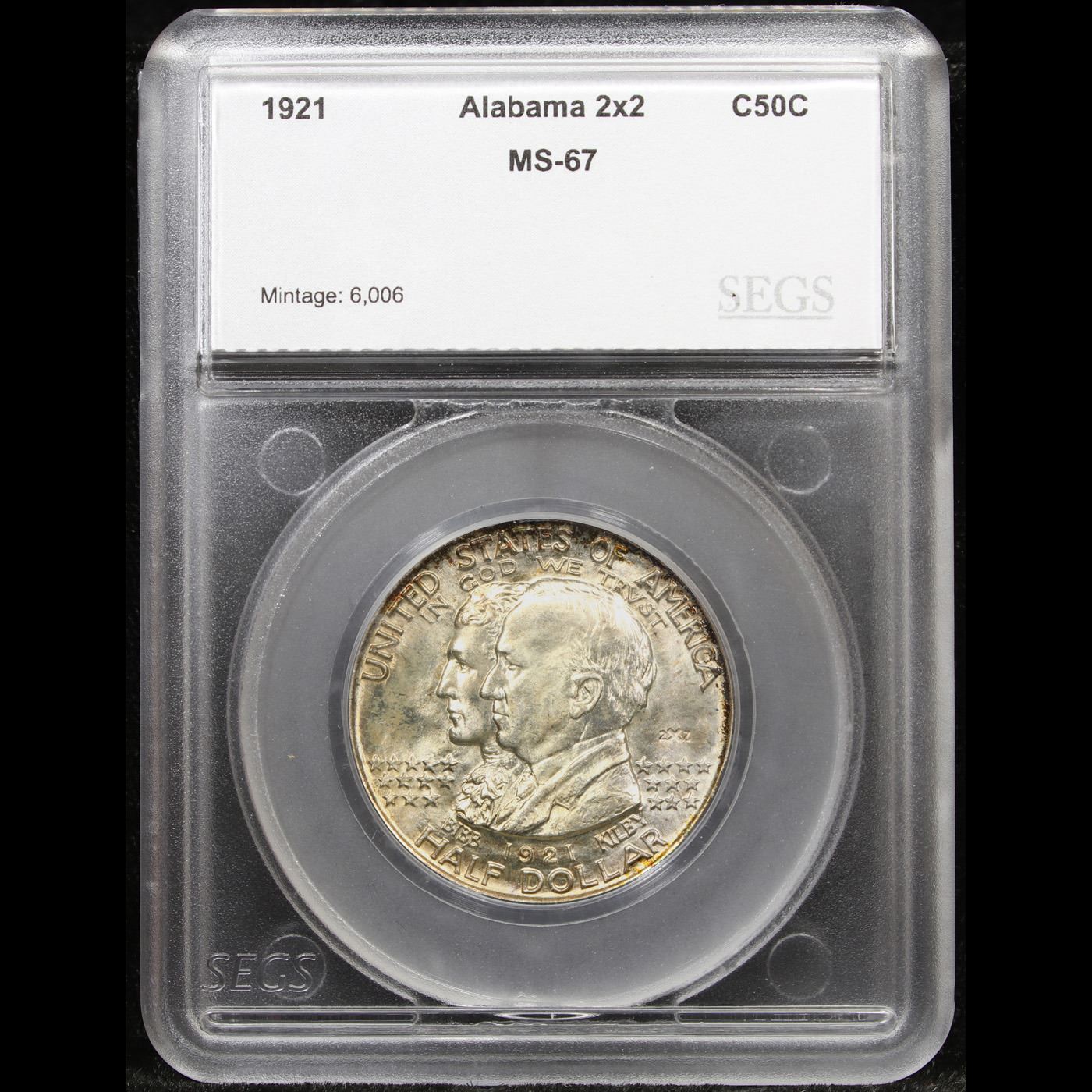 ***Auction Highlight*** 1921 Alabama 2x2 Near Top POP! Old Commem Half Dollar 50c Graded ms67 By SEGS. Uncirculated Examples will still Posses Luster on the Higher Points of the Design, namely on Kilby’s Upper Ear and on the Eagle’s Breast, Leg and Talons. Wear First Appears on Kilby's Forehead and Cheek and on the Eagle's Neck, Wingtip and Upper Edge of its Wing. Only 10% of the Issue was Made with the 2x2 Mark.