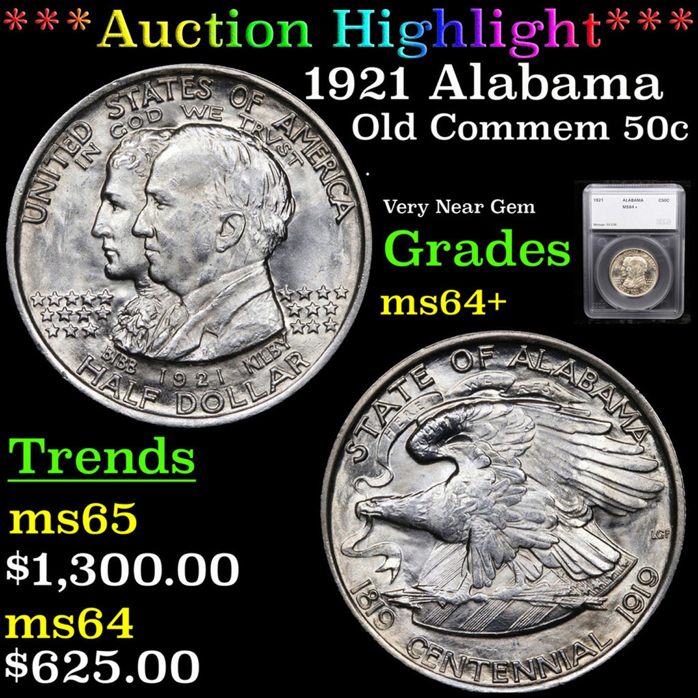 ***Auction Highlight*** 1921 Alabama Old Commem Half Dollar 50c Graded ms64+ By SEGS (fc)
