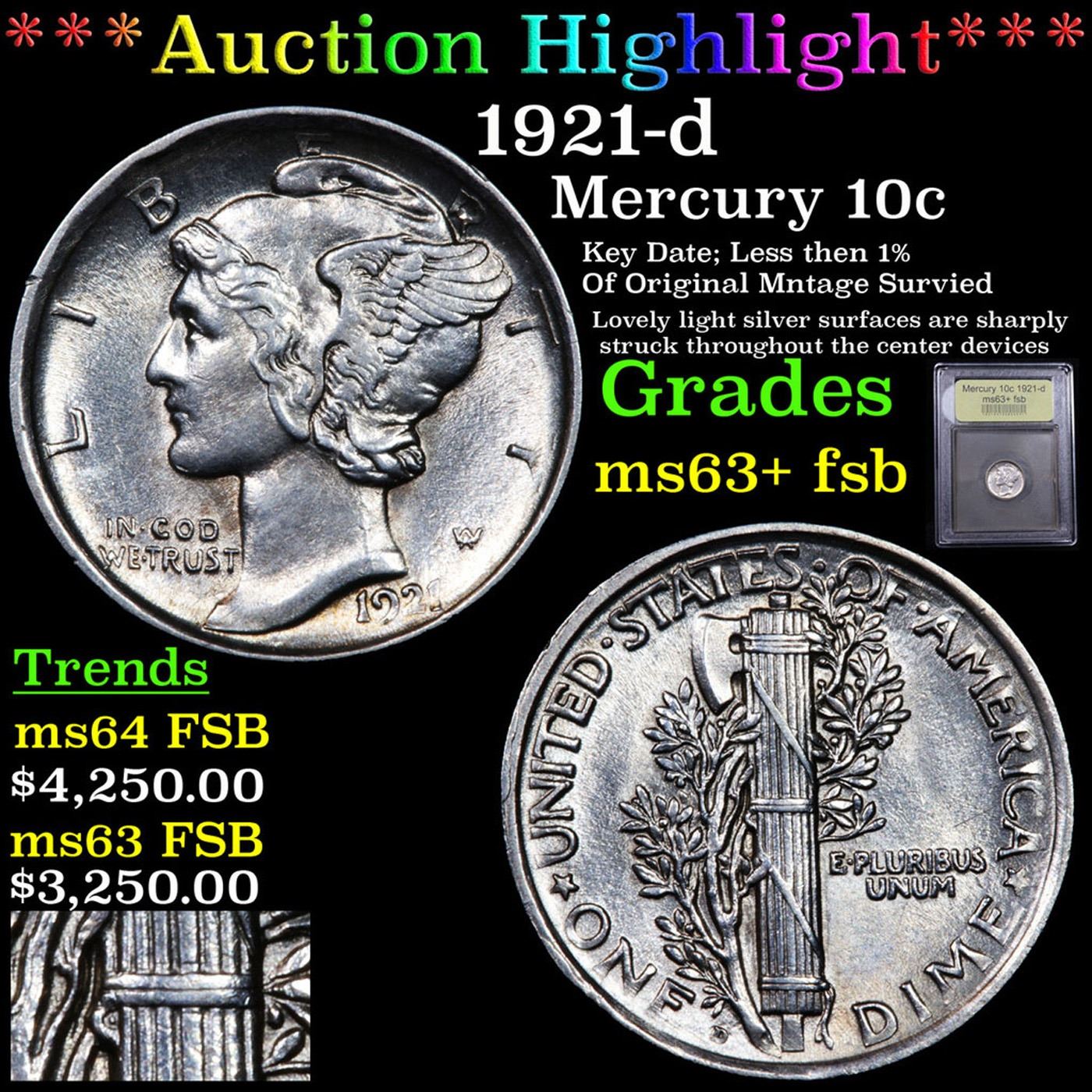 ***Auction Highlight*** 1921-d Mercury Dime 10c Graded Select Unc+ FSB By USCG. Lovely light silver surfaces are sharply struck throughout the center devices with some weakness on the edges. Carefully preserved to be nearly in the full Gem category. One of the scarcest issues in the Mercury dime series, eclipsed only by the 1916-D and 1942/1 P and D overdates. It's on par with the 1921 in terms of desirability. Probably less than 1% of the original mintage has survived to the present time. The Mint State supply amounts to just a few hundred coins. Trends ms63 FSB $3,250 ms64 FSB $4,250 A Corey's Pick, Bid to Win, Don't let it get Away Coin