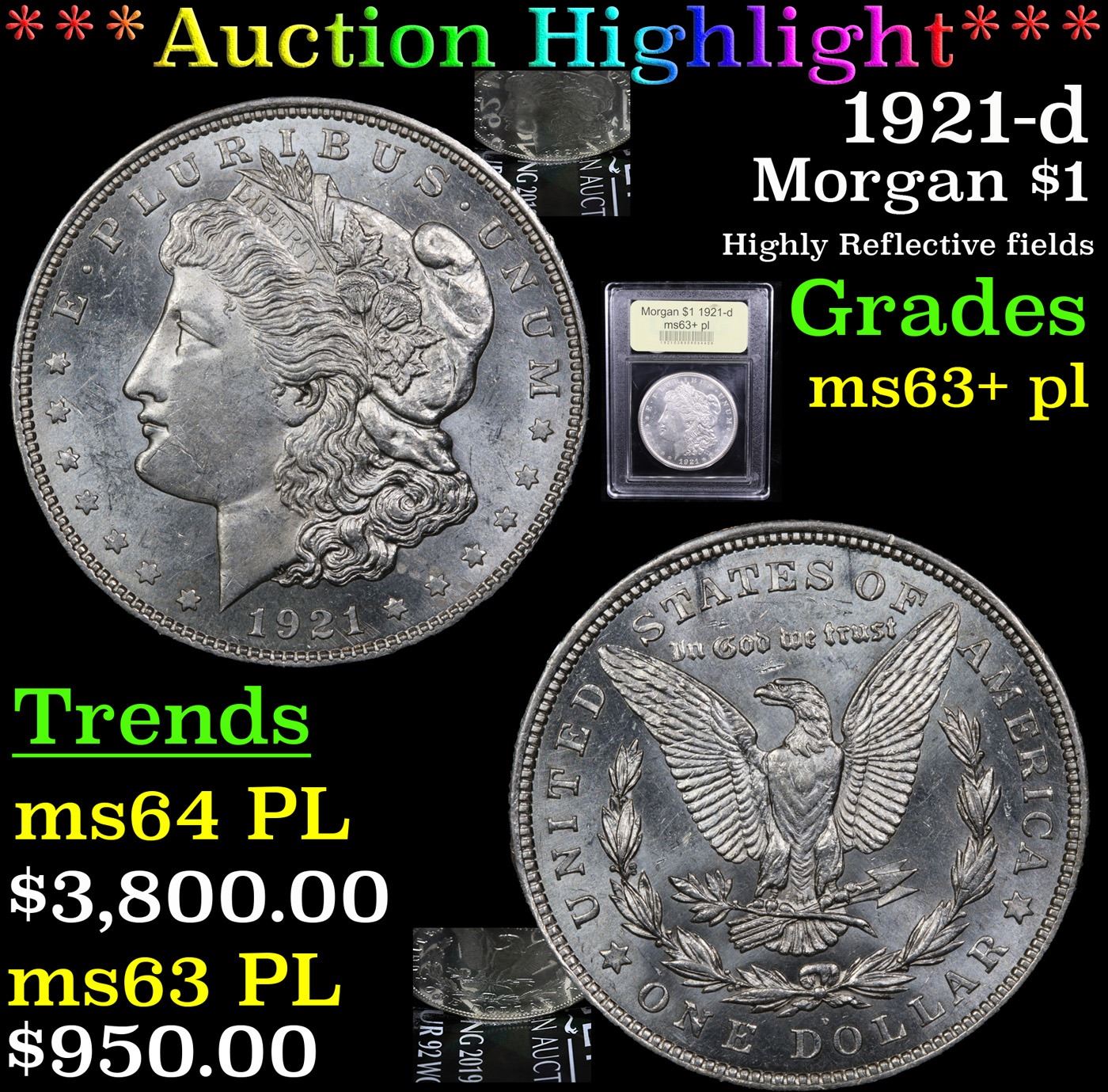 ***Auction Highlight*** 1921-d Morgan Dollar $1 Graded Select Unc+ PL By USCG. The Denver Mint struck more than 20 million Morgan dollars in 1921, but remarkably few survivors exhibit any degree of proof like mirroring in the fields. This coin is one of just a handful of Uncirculated Proof like examples. The devices display a softly frosted texture, and the design definition is above-average for the issue. A pleasing, essentially brilliant representative of this sole D-mint Morgan. A Corey's Pick, Bid to Win, Don't let it get Away Coin