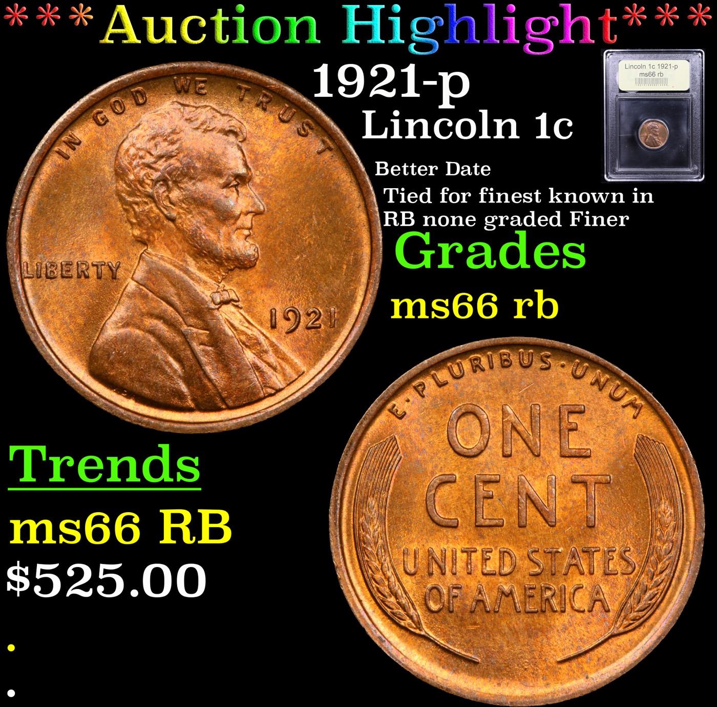 ***Auction Highlight*** 1921-p Lincoln Cent 1c Graded GEM+ Unc RB By USCG. Tied for finest RB of the date certified by NGC or PCGS. Intensely lustrous deep red-orange surfaces exhibit bold carmine and sunset orange toning highlights. A superb Gem with exceptional eye appeal, and "well worth the price of admission" so to speak. None finer within the RB designation. A Corey's Pick, Bid to Win, Don't let it get Away, you might not find its equal Coin