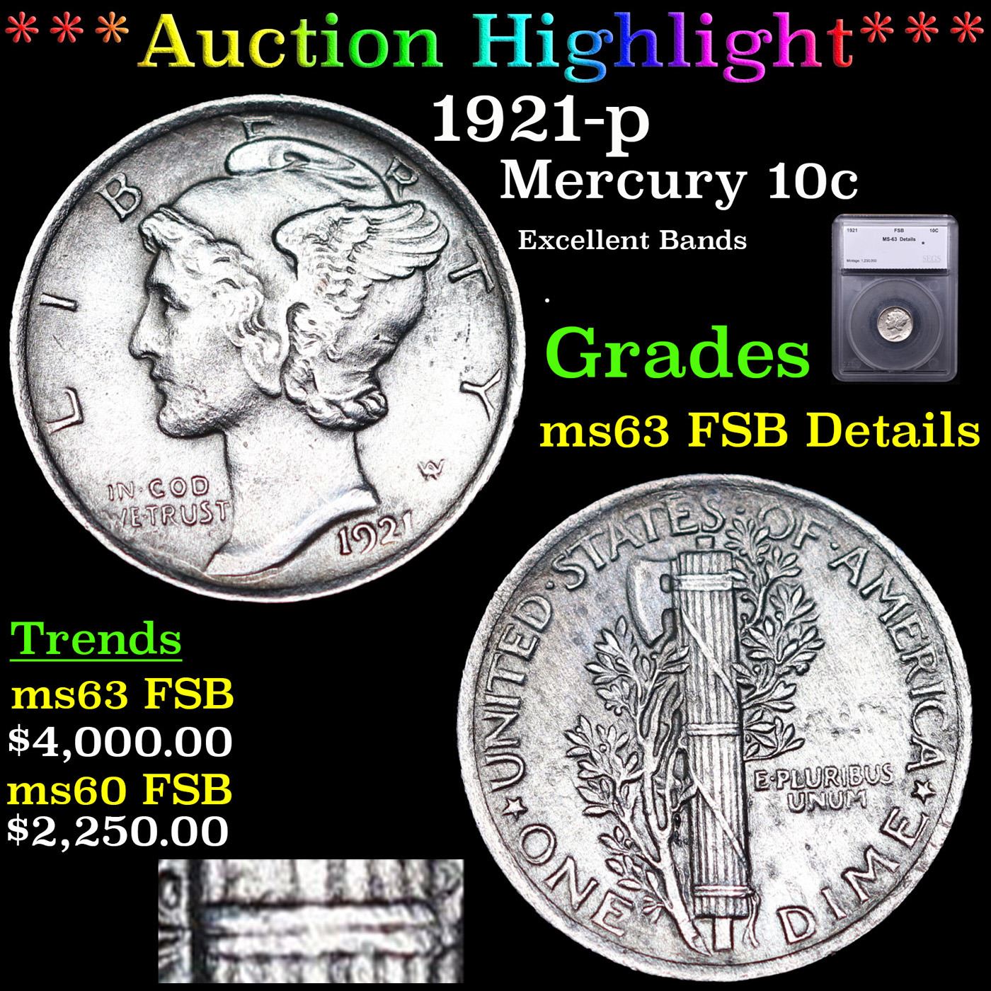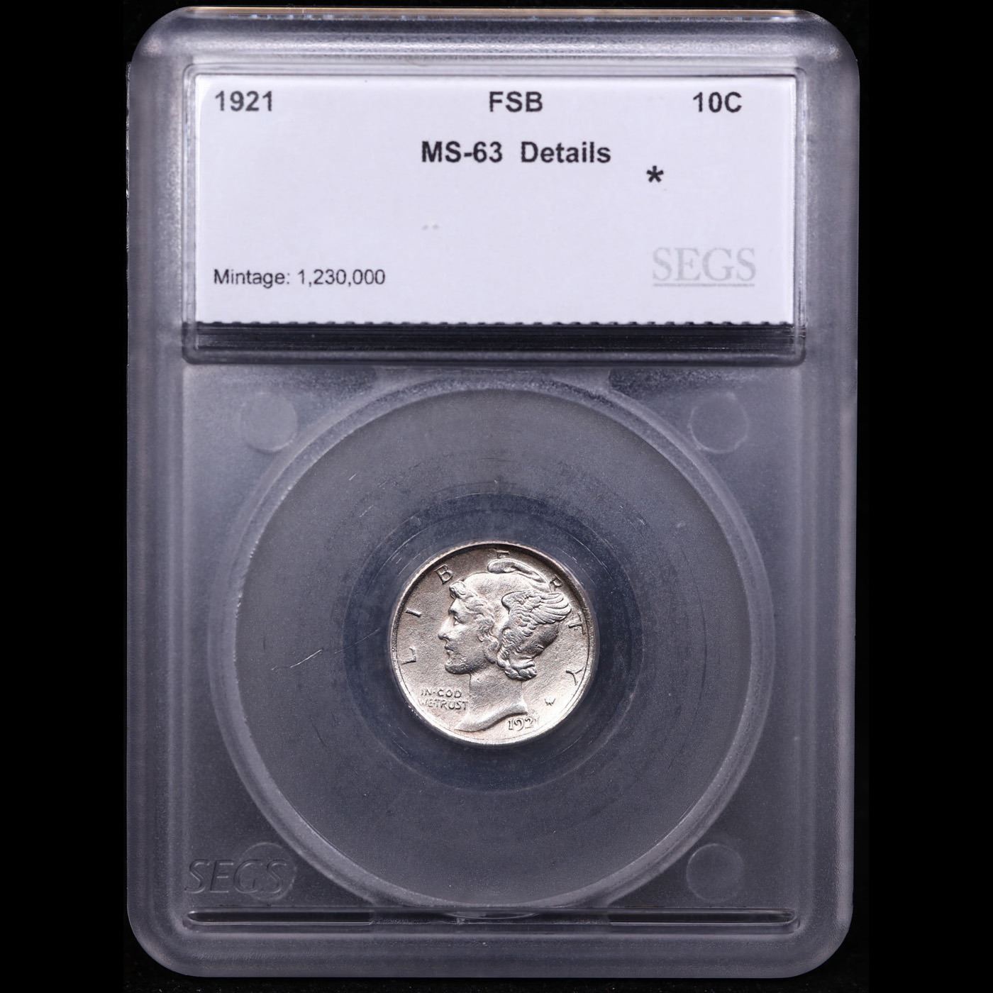 ***Auction Highlight*** 1921-p Mercury Dime 10c Graded ms63 FSB Details By SEGS.