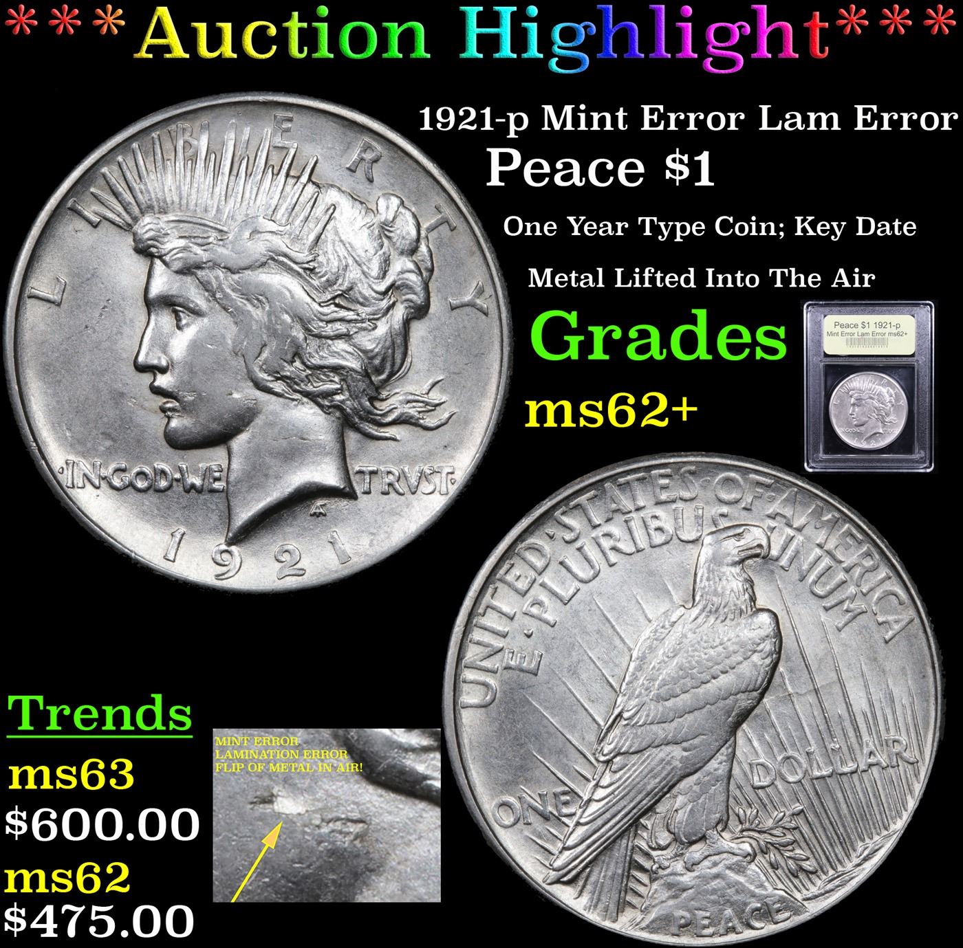 ***Auction Highlight*** 1921-p Mint Error Lam Error Peace Dollar $1 Graded Select Unc By USCG (fc)