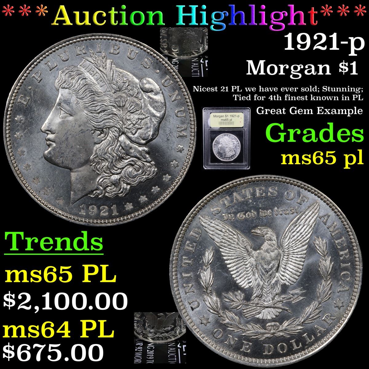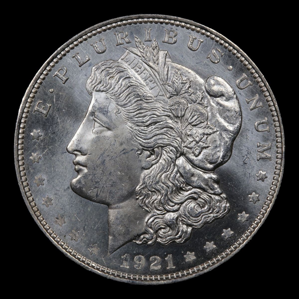 ***Auction Highlight*** 1921-p Morgan Dollar $1 Graded GEM Unc PL By USCG. Untoned brilliant white surfaces possess an uncommon degree of reflectivity in the fields for an example of this otherwise plentiful final year Morgan dollar issue. Combine the PL finish with razor sharp striking detail and superior surface preservation and what we have here is an impressive strike and condition rarity in a 1921 Morgan dollar. A Corey's Pick, Bid to Win, Don't let it get Away Coin