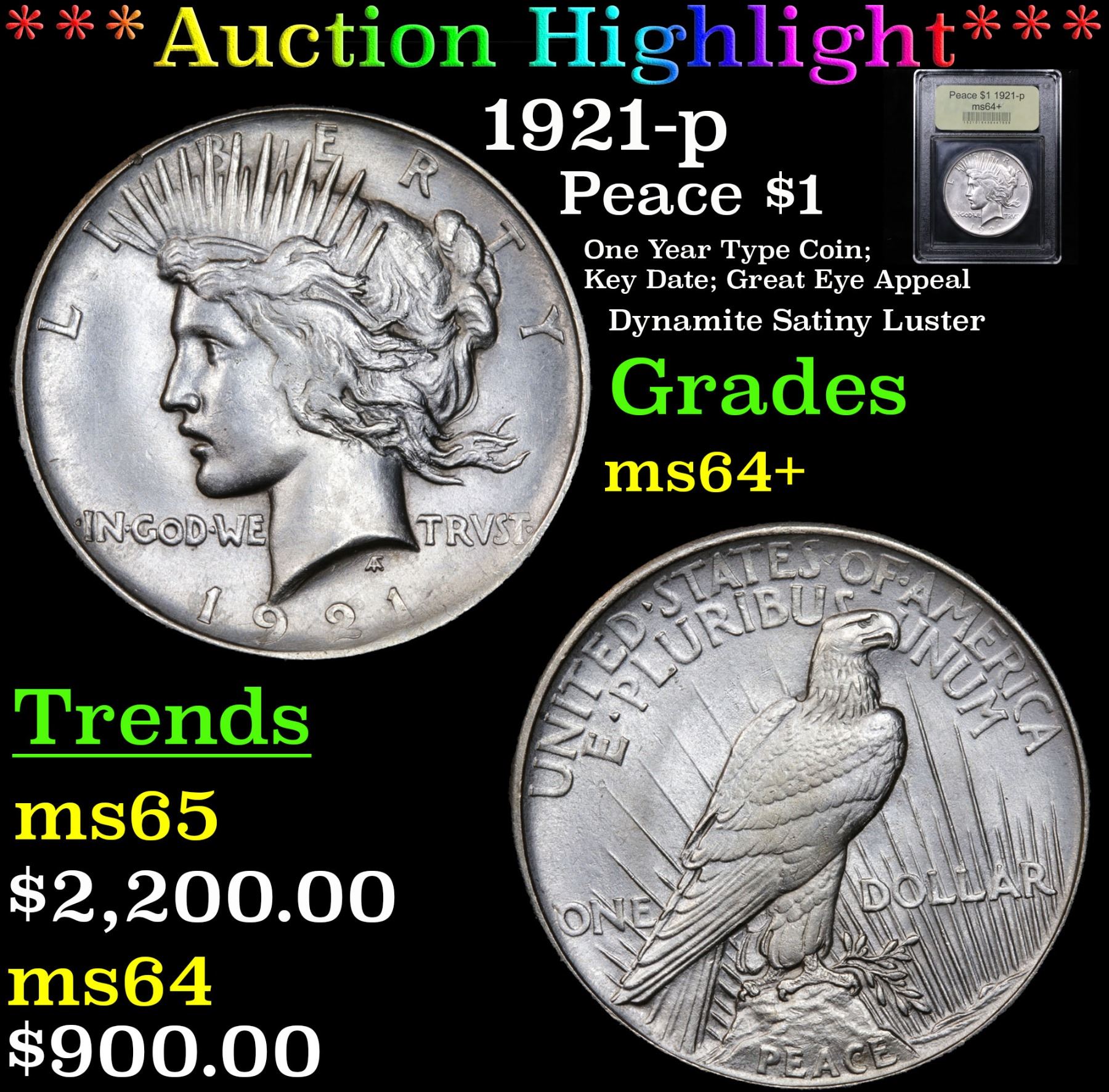 ***Auction Highlight*** 1921-p One Year Type Coin; Key Date; Great Eye Appeal Dynamite Satiny Luster Peace Dollar $1 Graded Choice+ Unc By USCG. A Corey's Pick, Bid to Win, Don't let it get Away Coin
