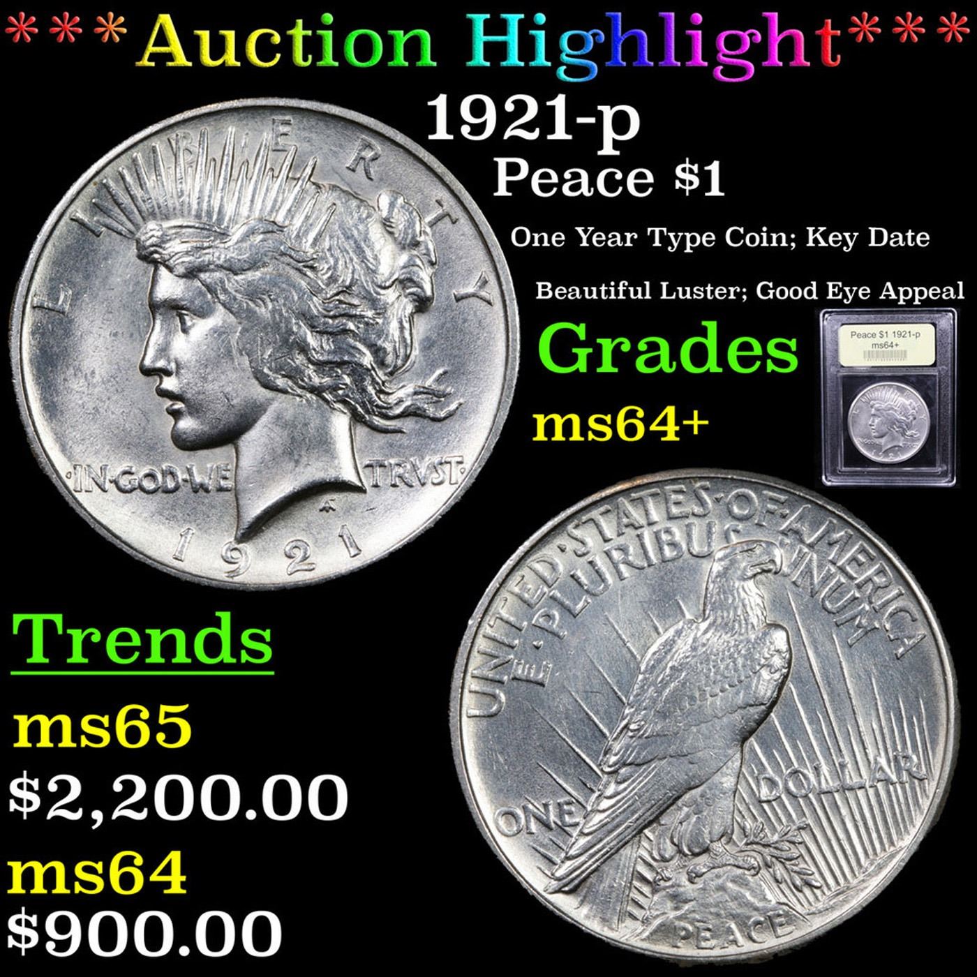 ***Auction Highlight*** 1921-p Peace Dollar $1 Graded Choice+ Unc By USCG. A Corey's Pick, Bid to Win Coin