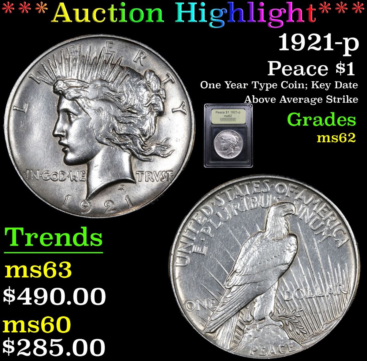 Key Date Coins Inc dba Silver Trades does guarantee the authenticity of all coins being auctioned, but in no way guarantees the condition or grade of any coin being auctioned regardless of any subjective opinion put forth by Key Date Coins Inc dba Silver Trades. It is the buyer’s sole responsibility to be the judge of the coins grade/condition by the pictures/video provided. Buyers are further encouraged to contact Key Date Coins Inc dba Silver Trades with any questions prior to the start of the auction.
