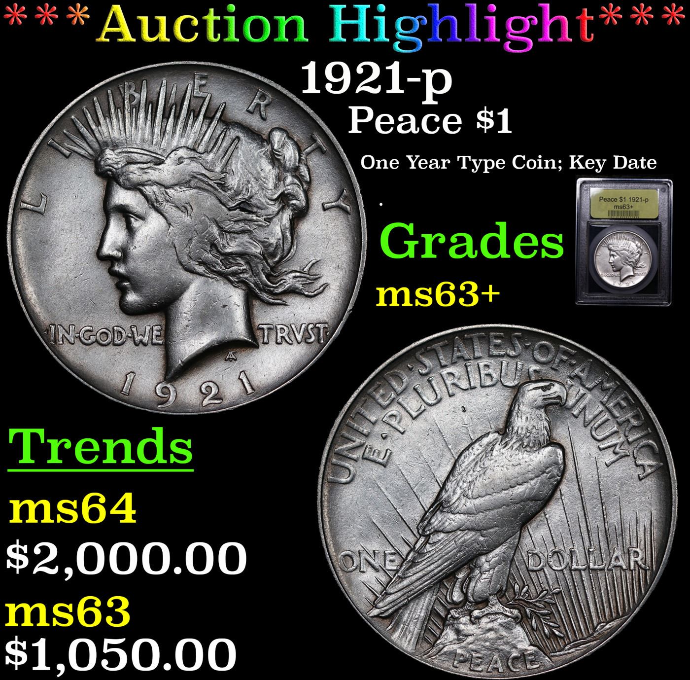 ***Auction Highlight*** 1921-p Peace Dollar $1 Graded Select+ Unc By USCG.