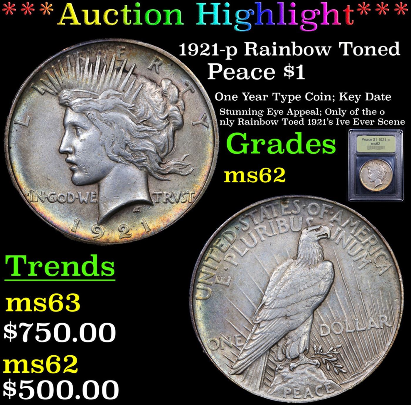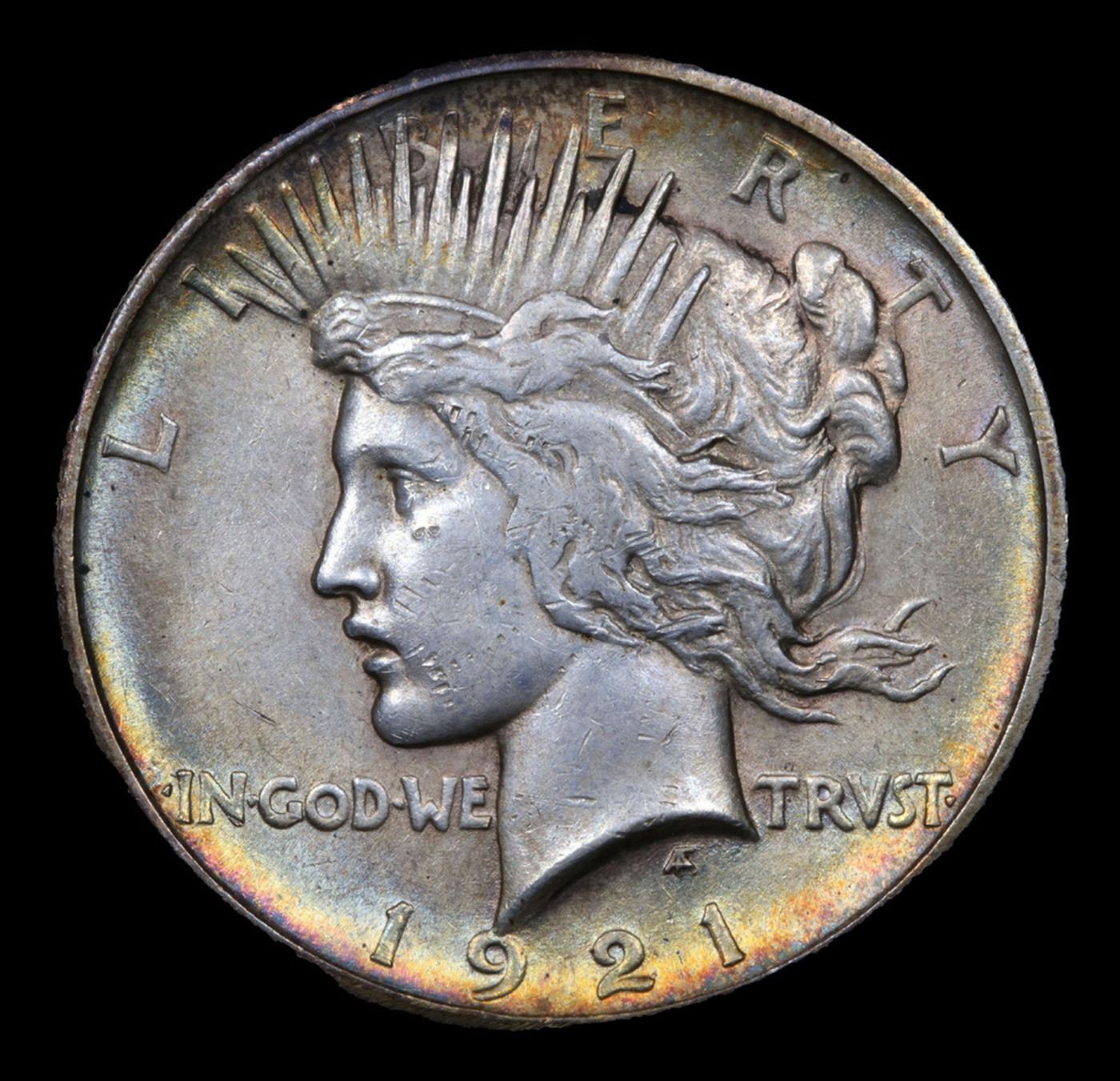 ***Auction Highlight*** 1921-p Rainbow Toned Peace Dollar $1 Graded Select Unc By USCG (fc)