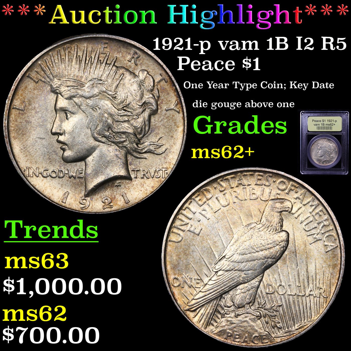 ***Auction Highlight*** 1921-p vam 1B I2 R5 Peace Dollar $1 Graded Select Unc By USCG.