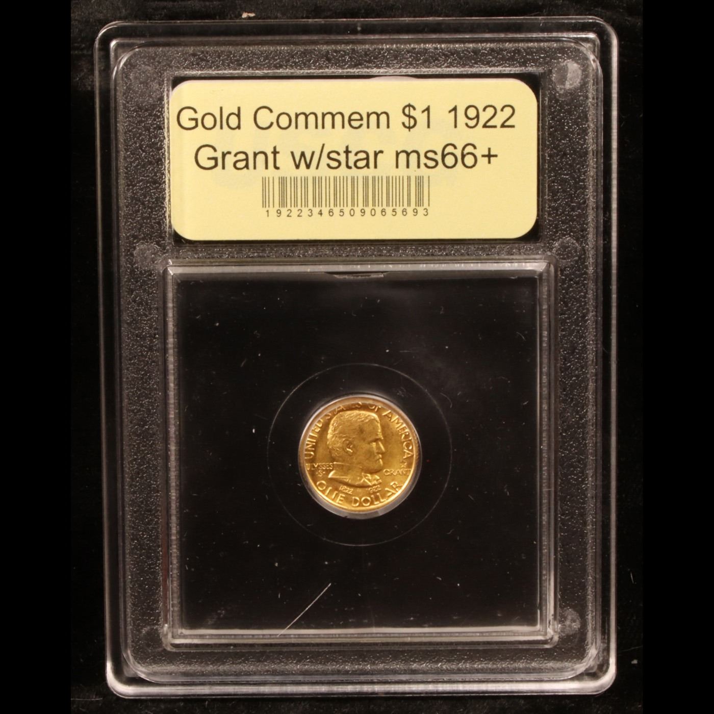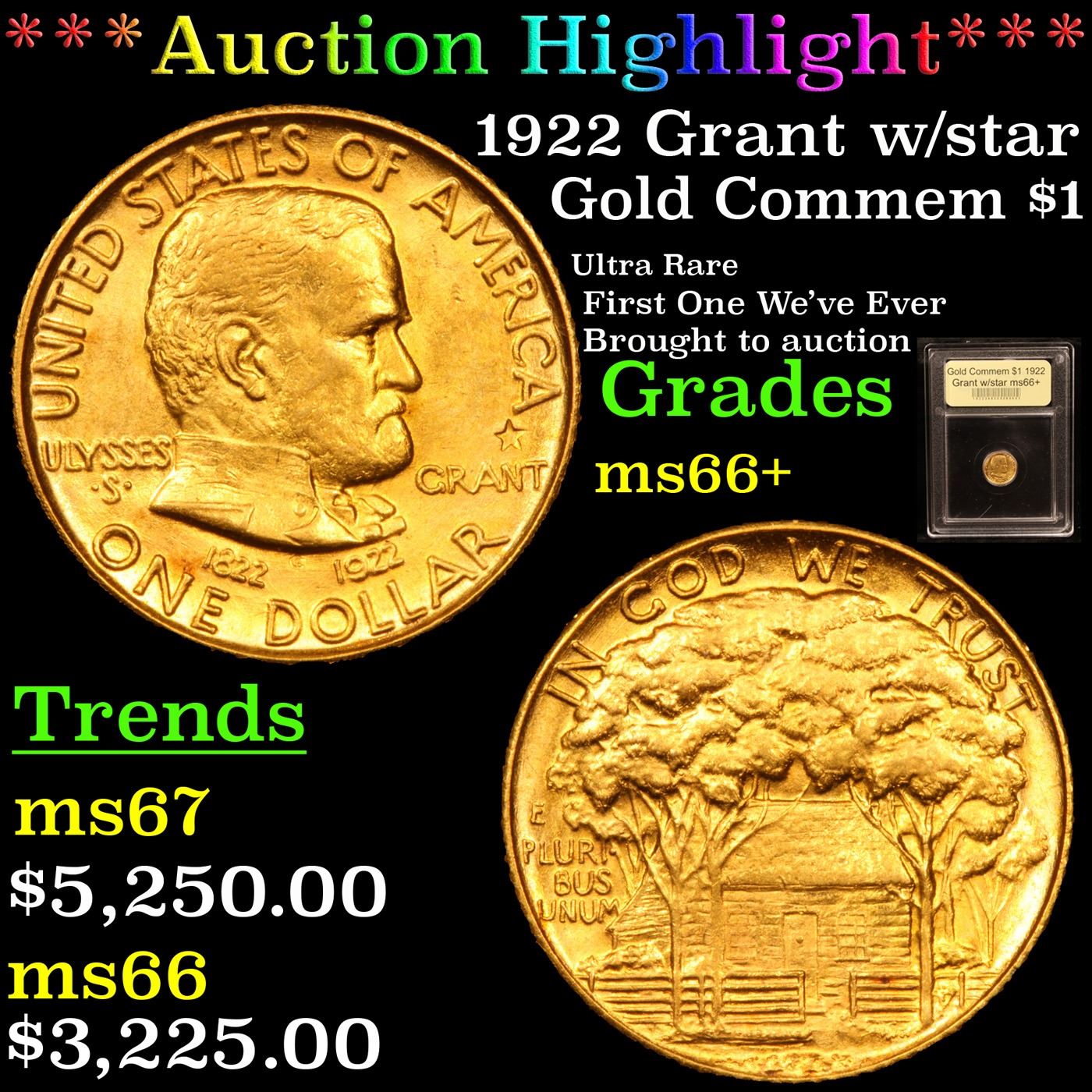 ***Auction Highlight*** 1922 Grant w/star Gold Commem Dollar 1 Graded GEM++ Unc By USCG. This is an outstanding, high end MS-62+ to represent the conditionally challenging 1886-O silver dollar. Sharply struck with fulsome mint luster, both sides also possess a brilliant silver white appearance. Illustrative of one of the situations that make the Morgan dollar series so appealing to numismatists, this issue is far scarcer in Mint State than the 1883-O, 1884-O and 1885-O despite having a higher mintage (10,710,000 coins for the 1886-O as opposed to, for example, 9,185,000 pieces for the 1885-O). Given that the 1886-O is plentiful in worn condition, millions of examples likely found their way into circulation beginning in the late 19th century. Millions more, probably more than half of the mintage, were almost certainly kept in storage until melted under the terms of the 1918 Pittman Act. Today the conditionally challenging nature of this New Orleans Mint issue is well known, as is the prevalence of poorly struck coins among the relatively few Uncirculated survivors. Exceptionally well produced and preserved, the premium quality example offered here is sure to see spirited bidding. A Corey's Pick, Bid to Win, Don't let it get Away, you might not find its equal Coin