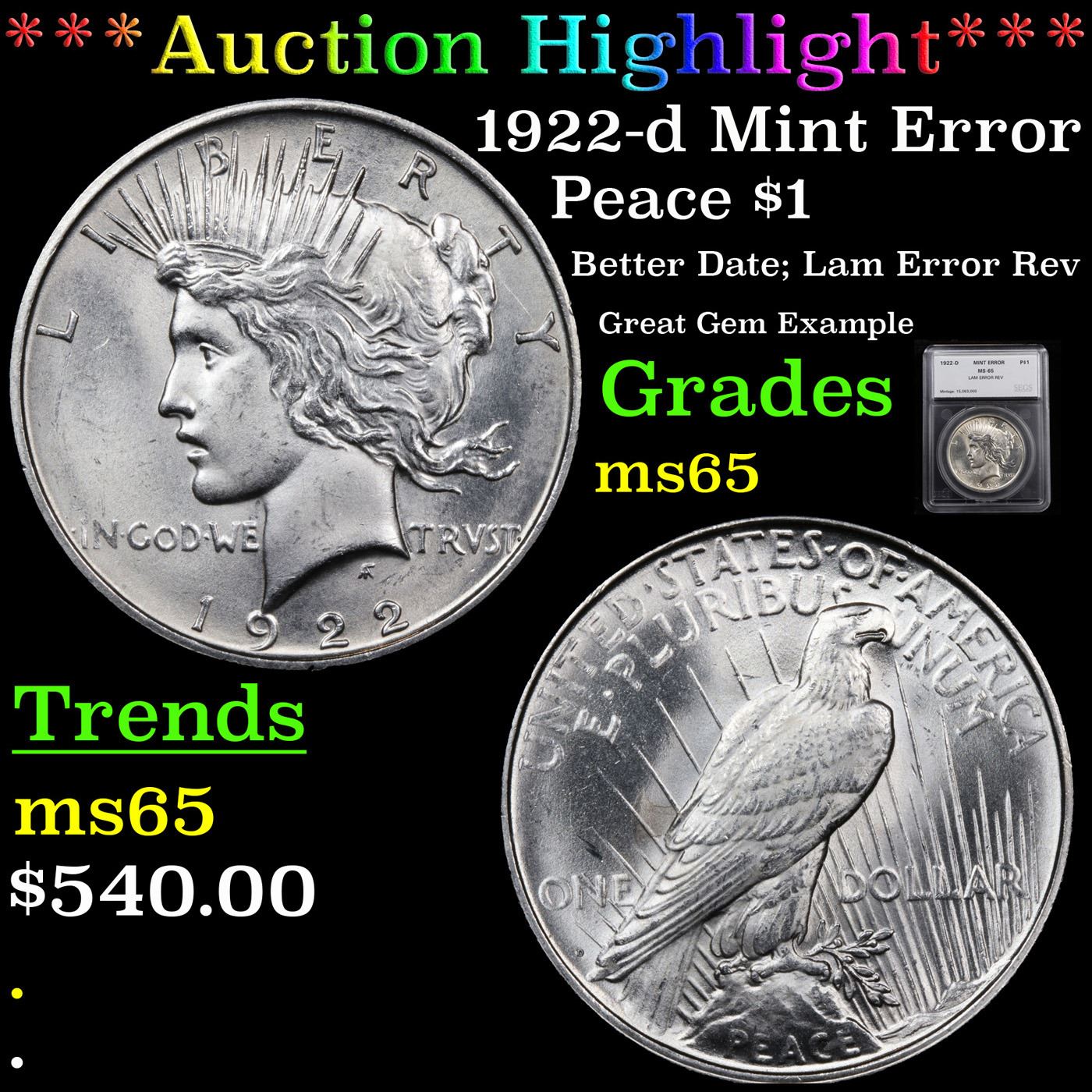 ***Auction Highlight*** 1922-d Mint Error Peace Dollar $1 Graded ms65 By SEGS. A Corey's Pick, Bid to Win Coin