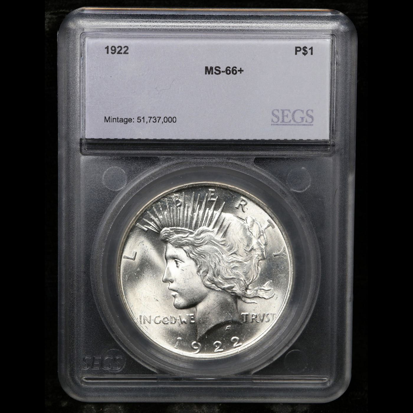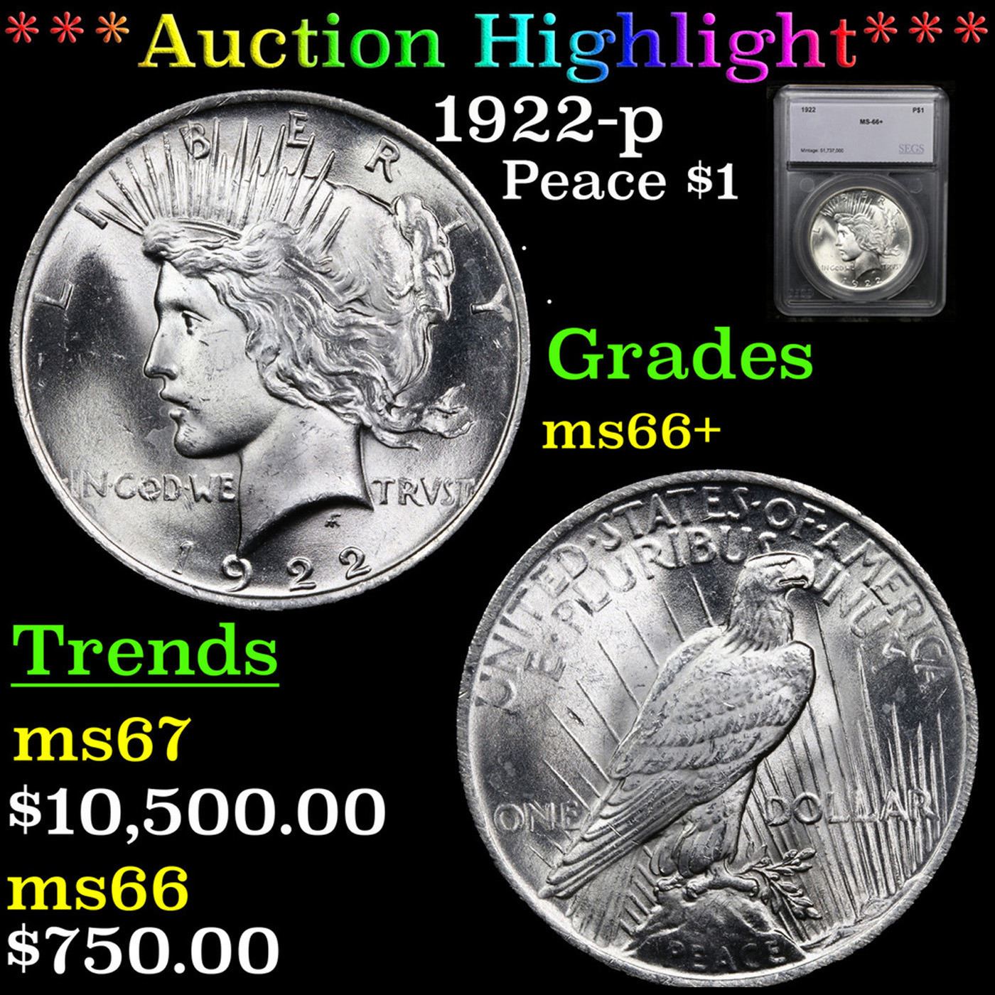 ***Auction Highlight*** 1922-p Peace Dollar 1 Graded ms66+ By SEGS.